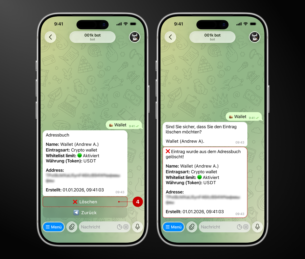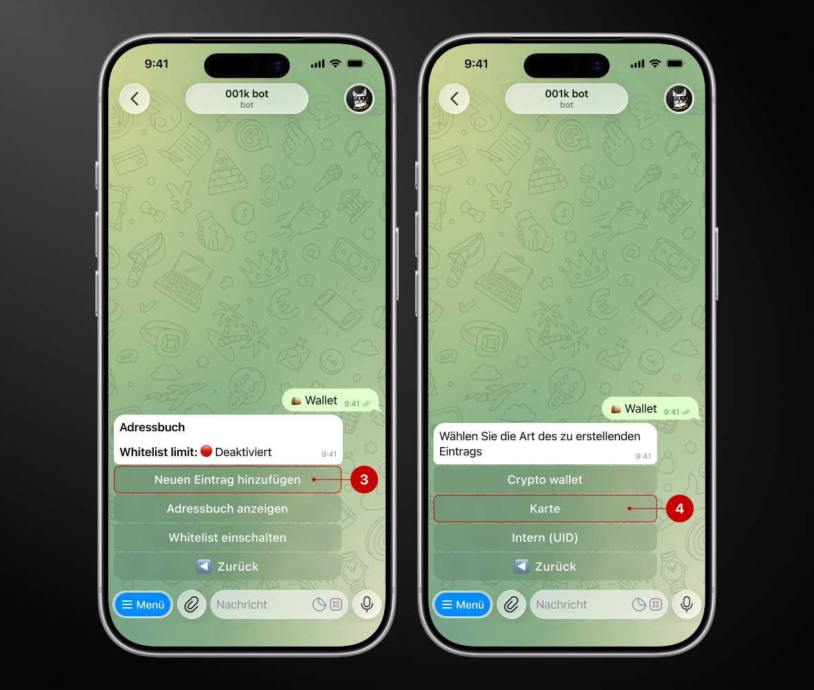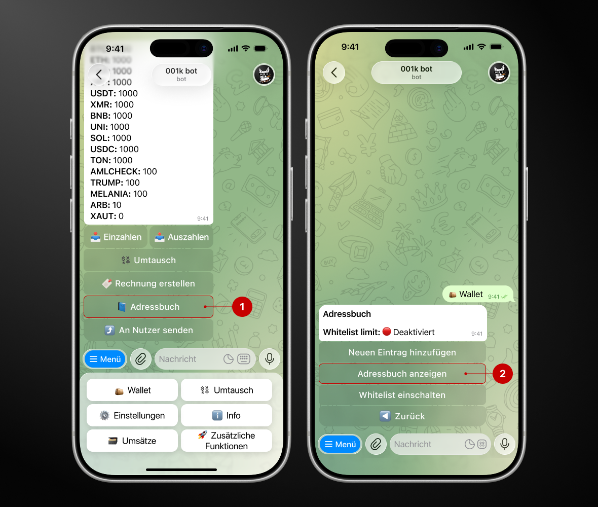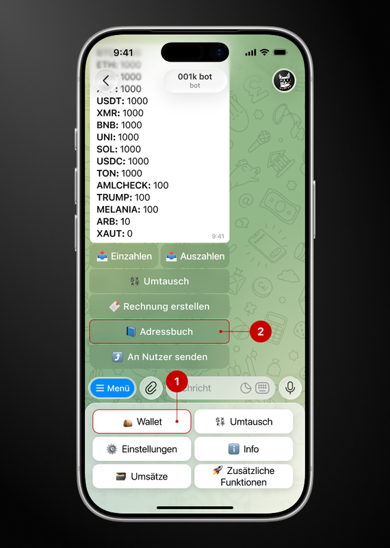 Schritt 1. Öffnen Sie den Bot → „Wallet“ → „Adressbuch“
