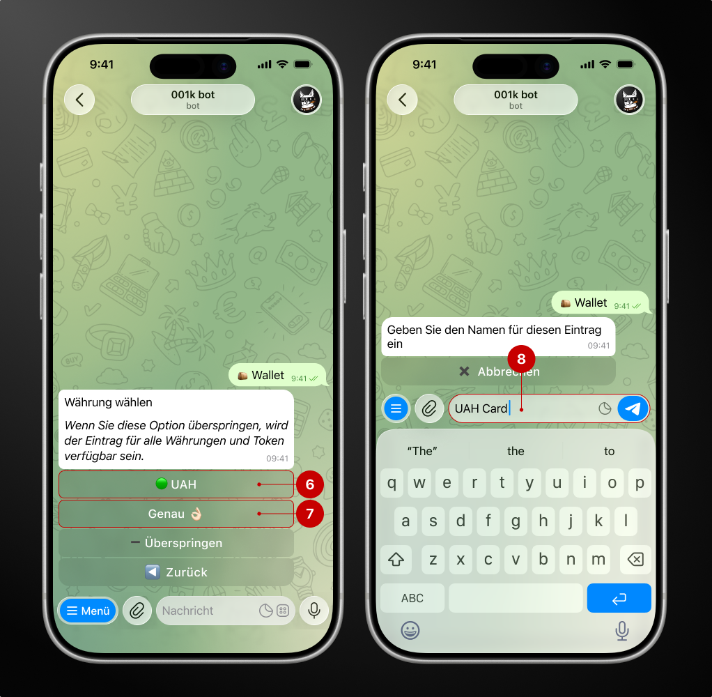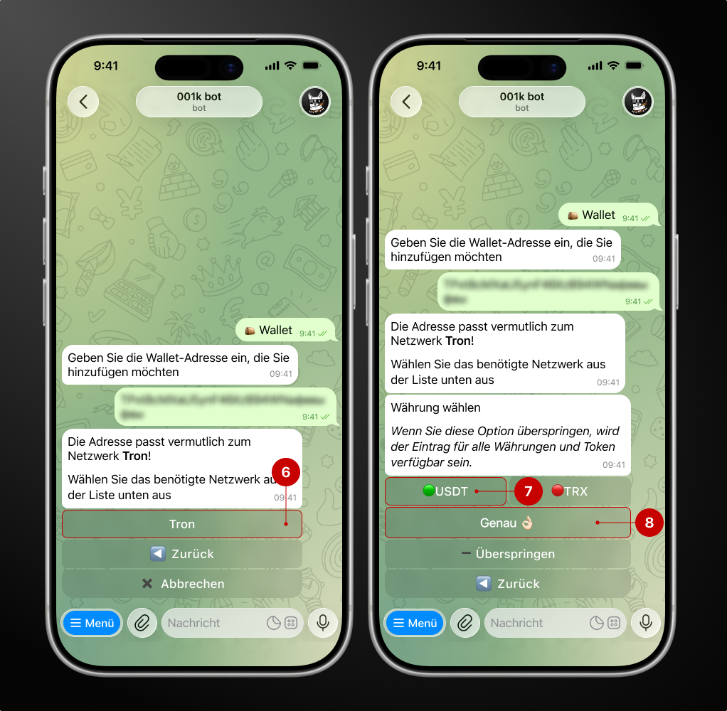 Um eine Währung zu speichern, klicken Sie auf das Feld USDT (7) und dann auf „Genau“ (8).