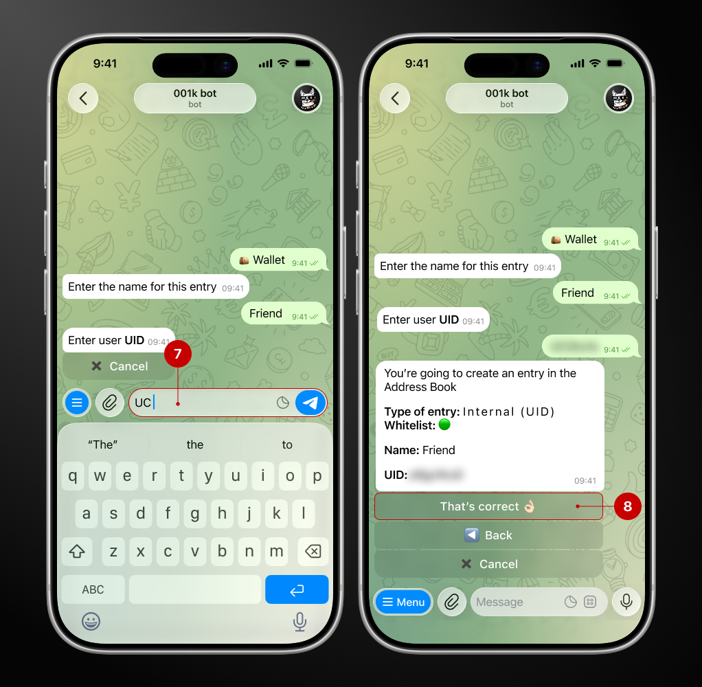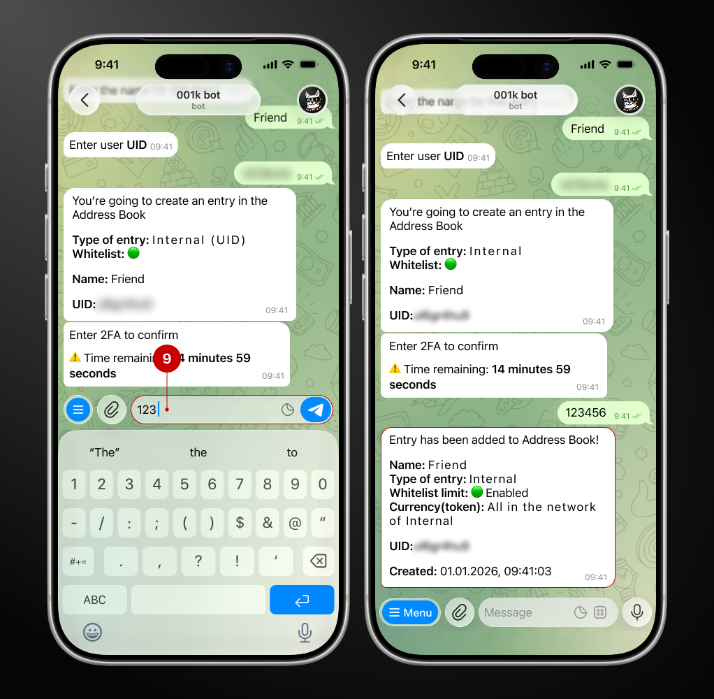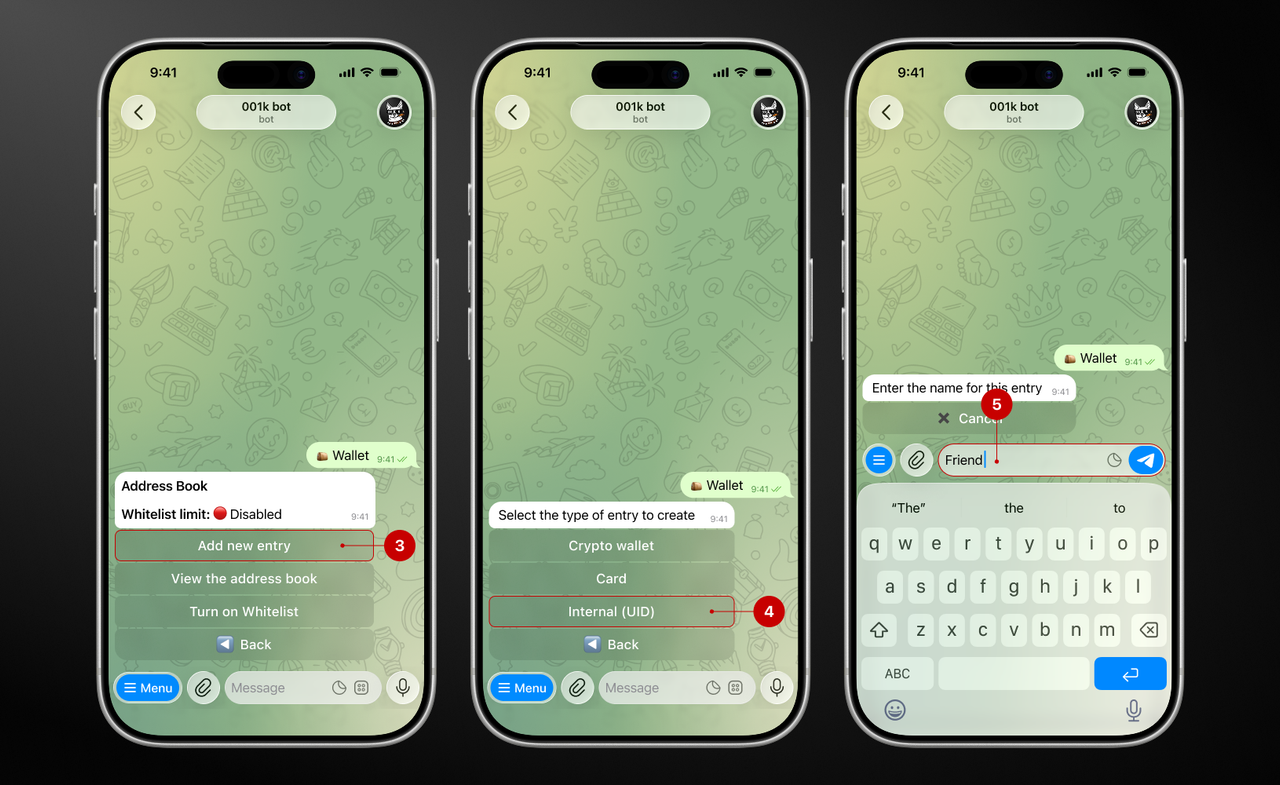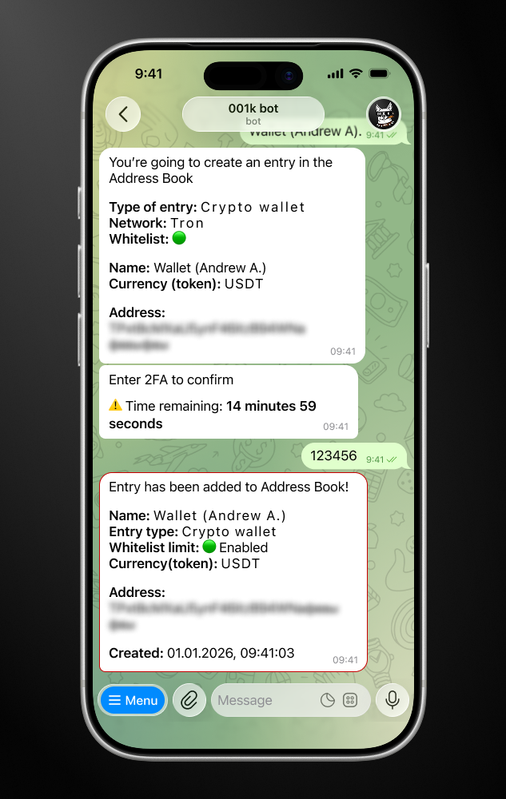 Remember when we used address books to store phone numbers? Our team has adapted this once-familiar tool for bot users. Now you can save crypto wallets, bank cards, and UID (the user's internal address in the bot) in your personal address book directly in the bot.
