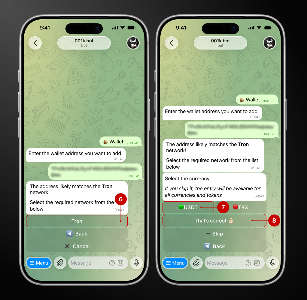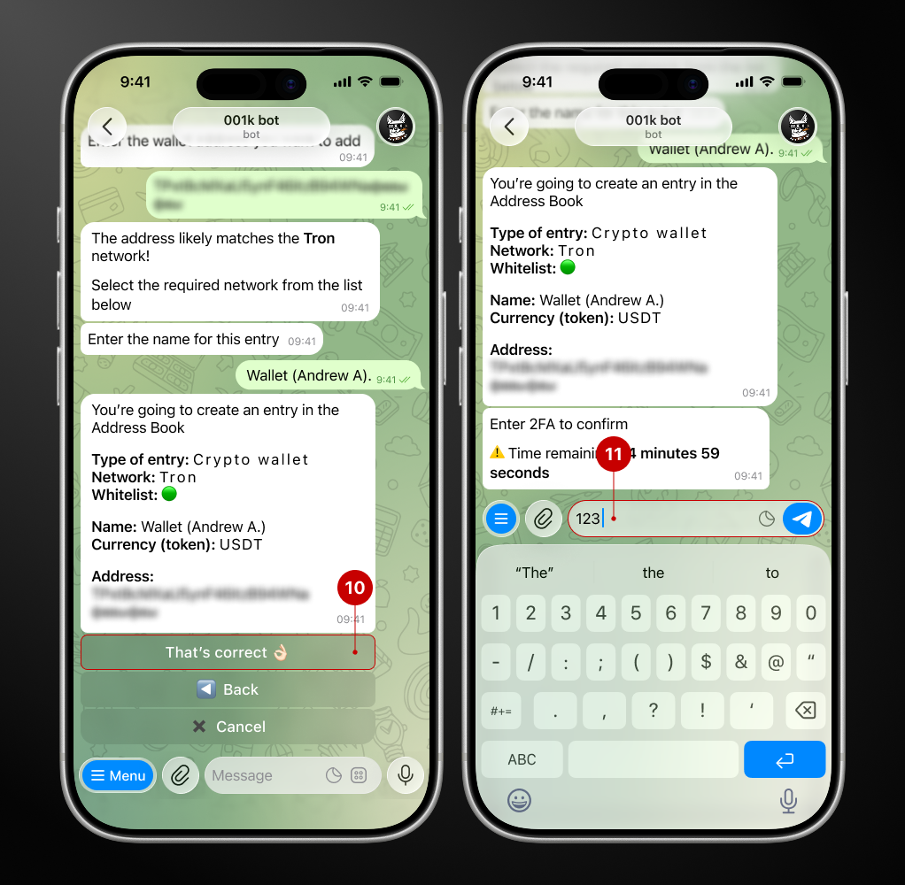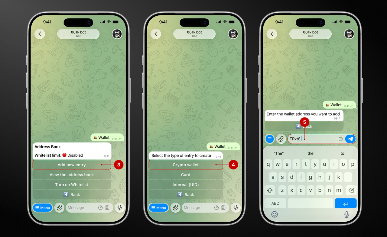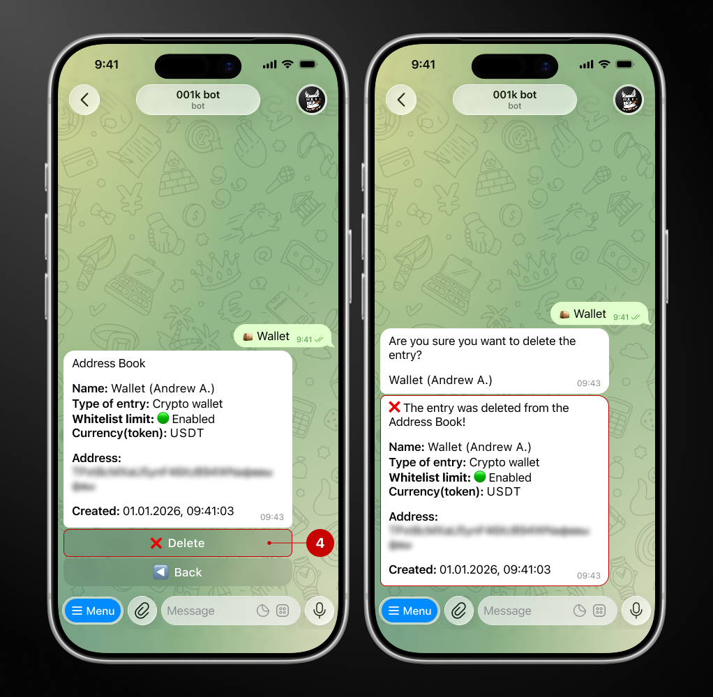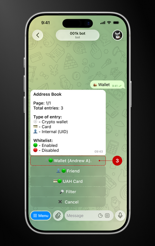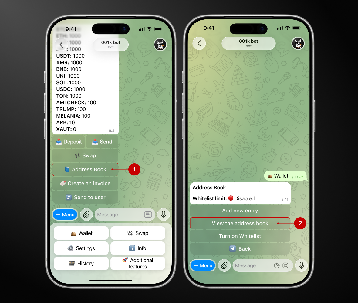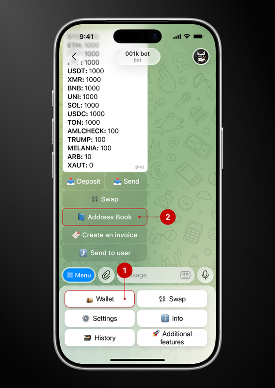 Step 1. Open the bot → Wallet → Address Book