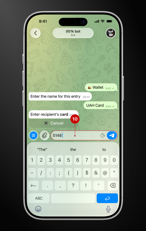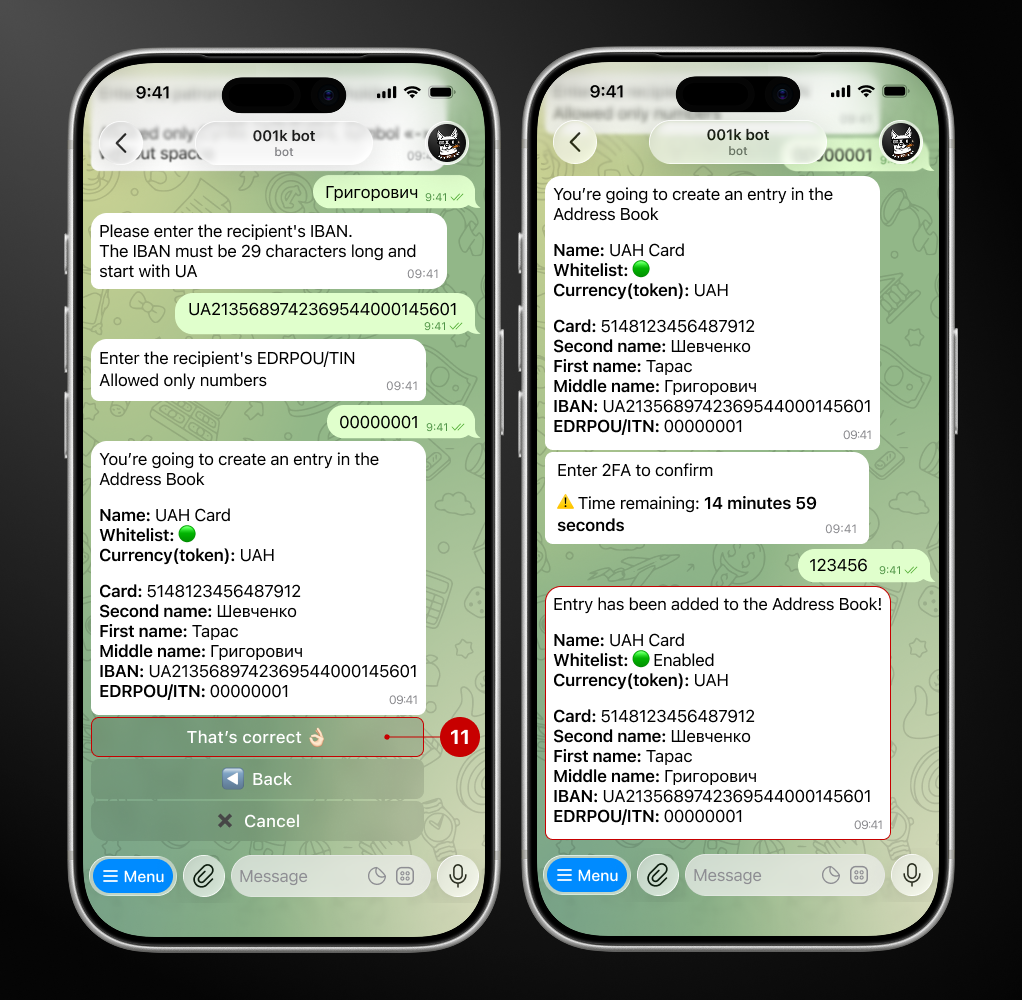 At this stage, you will also need: the cardholder's full name, IBAN, and EDRPOU/IPN. The data is requested in steps. Follow the bot's instructions and carefully check the information you have entered.
