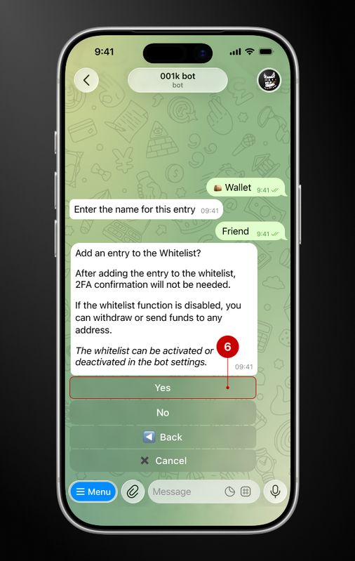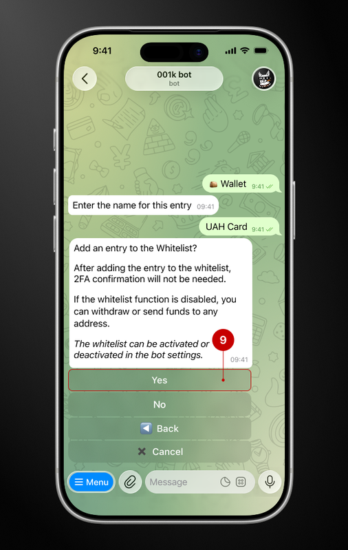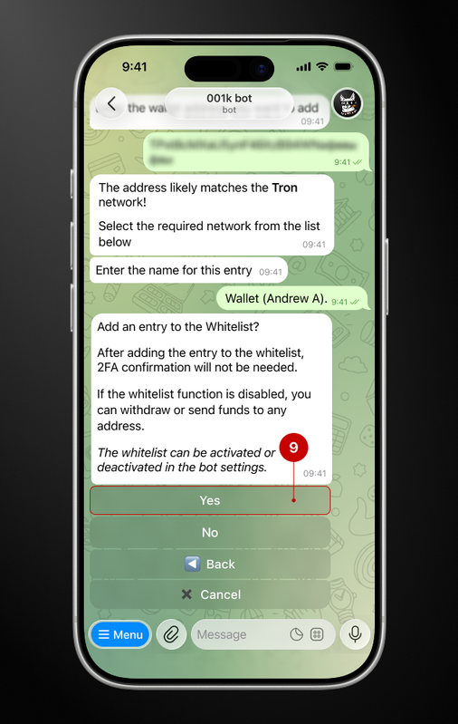 At this stage, the bot will ask for your approval to add the address to its whitelist. In our case, we want to add the entry to the whitelist, so we click on the “Yes” button (9).