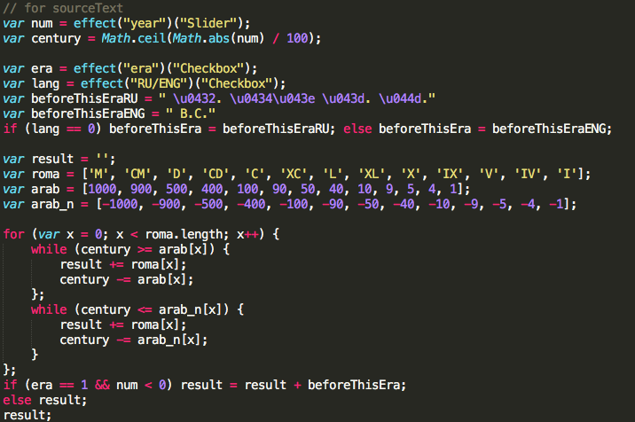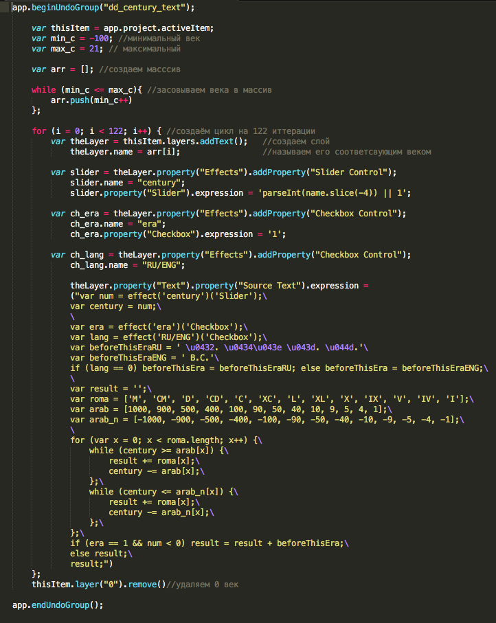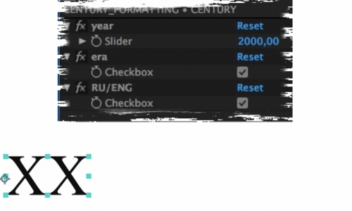 — Создаём текстовый слой, даём ему название из массива веков, создаем слайдер контрол, к нему в прописываем выражение, которое будет получать значение из названия слоя (хотя тут можно было пойти по другому и вместо этого туда присвоить i), далее создаём 2 чекбокса, и немного видоизменённое выражение для сурсТекста (стоит обратить внимание на бэкслешы, они нужны в конце каждой строки, и конечно же соблюдать у всех кавычек одинаковый рисунок, или экранить их),