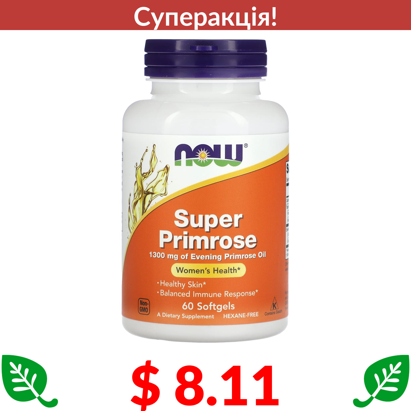 $ 8.11 Now Foods, Super Primrose, примула, 1300 мг, 60 капсул