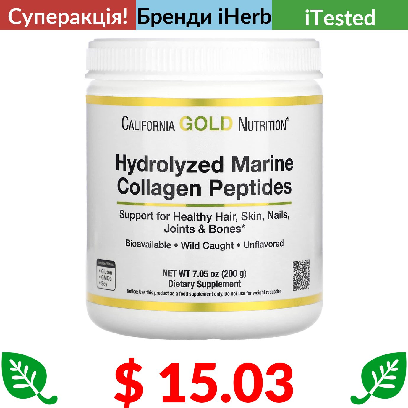$ 15.03 California Gold Nutrition, гідролізовані пептиди морського колагену, без добавок, 200 г (7,05 унції)