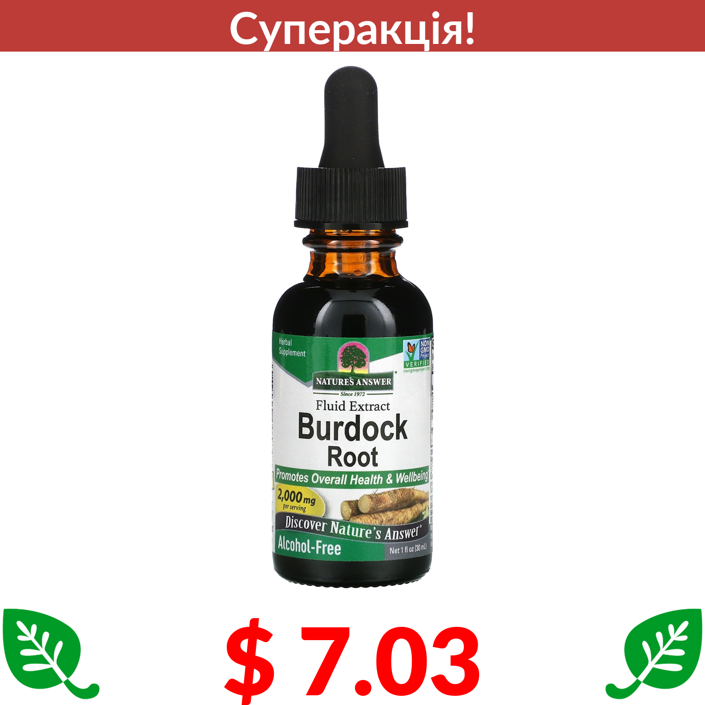 $ 7.03 Nature's Answer, екстракт кореня лопуха, без спирту, 1350 мг, 30 мл (1 рідк. унція)