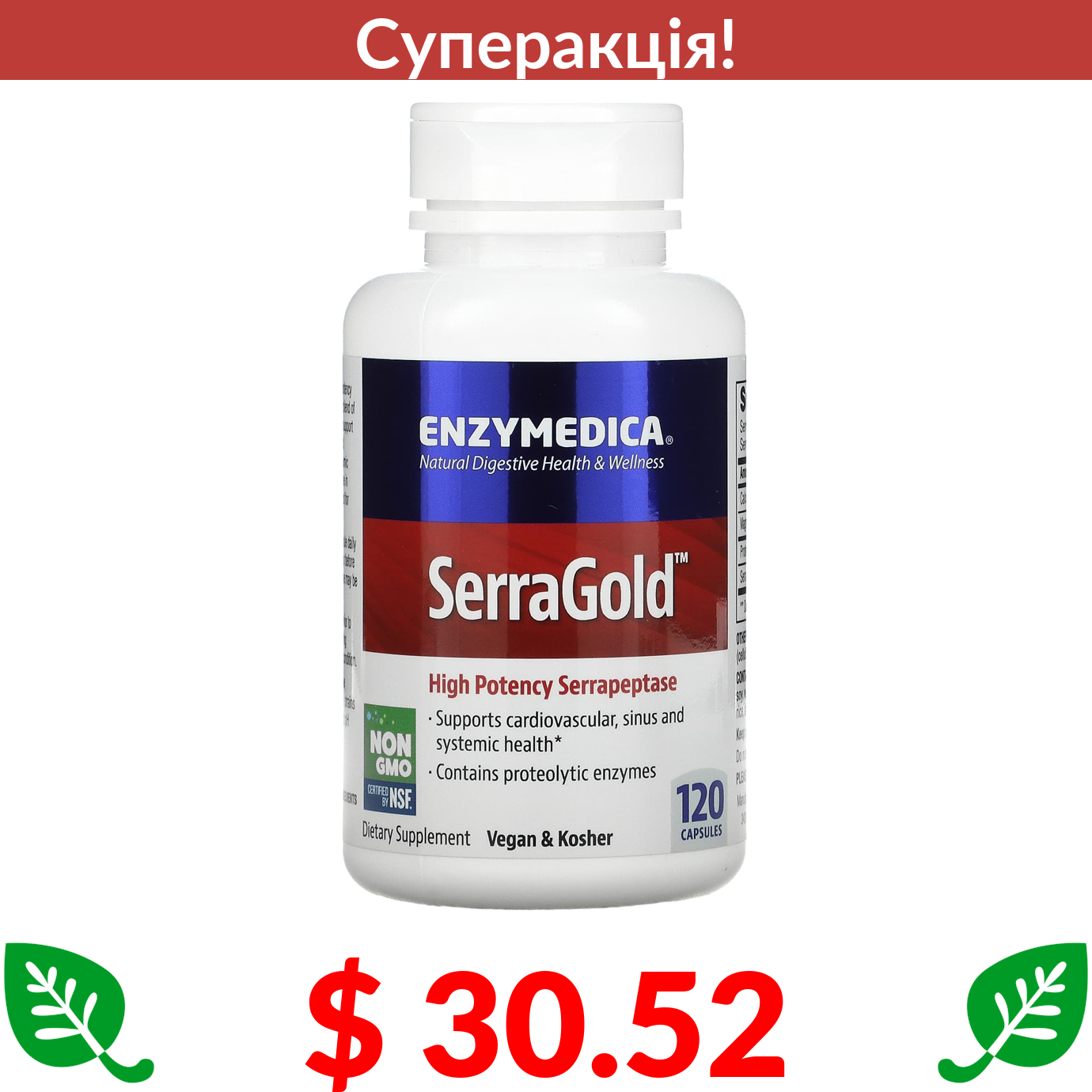 $ 30.52 Enzymedica, SerraGold, високоефективна серрапептаза, 120 капсул
