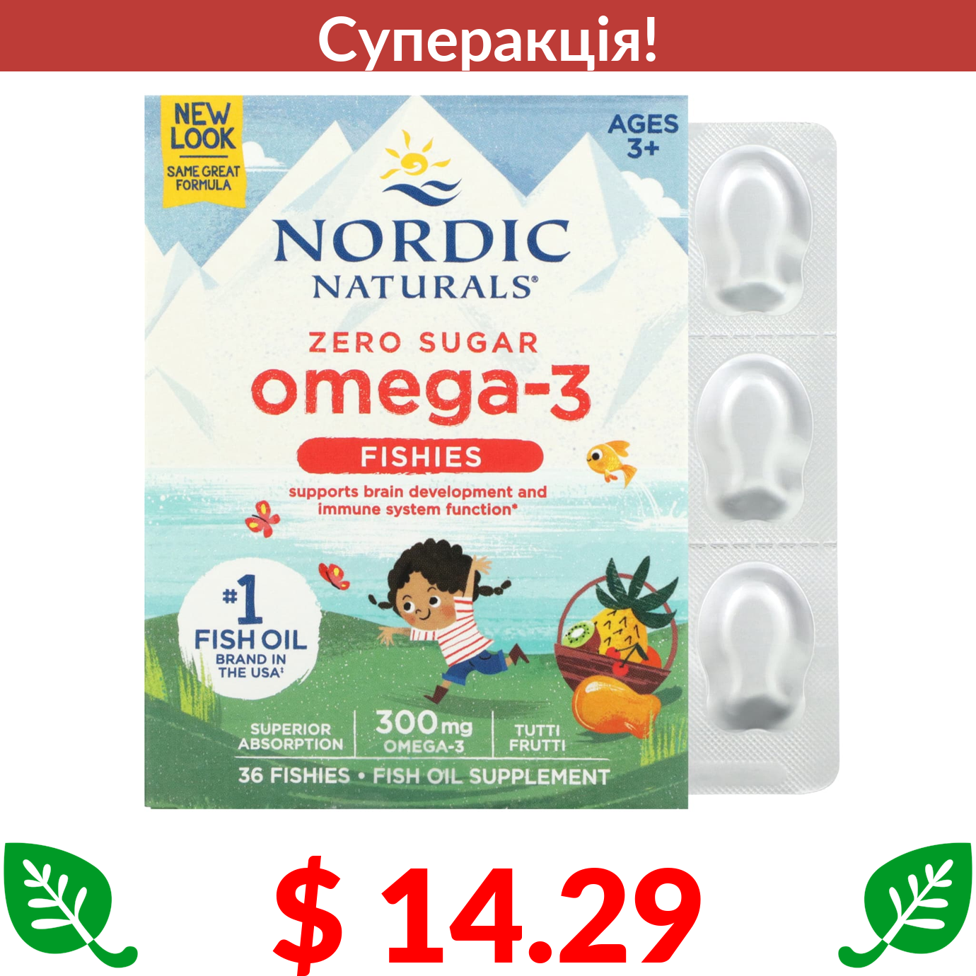 $ 14.29 Nordic Naturals, Omega-3 Fishies, без цукру, для дітей віком від 3 років, тутті-фрутті, 300 мг, 36 таблеток у формі рибок