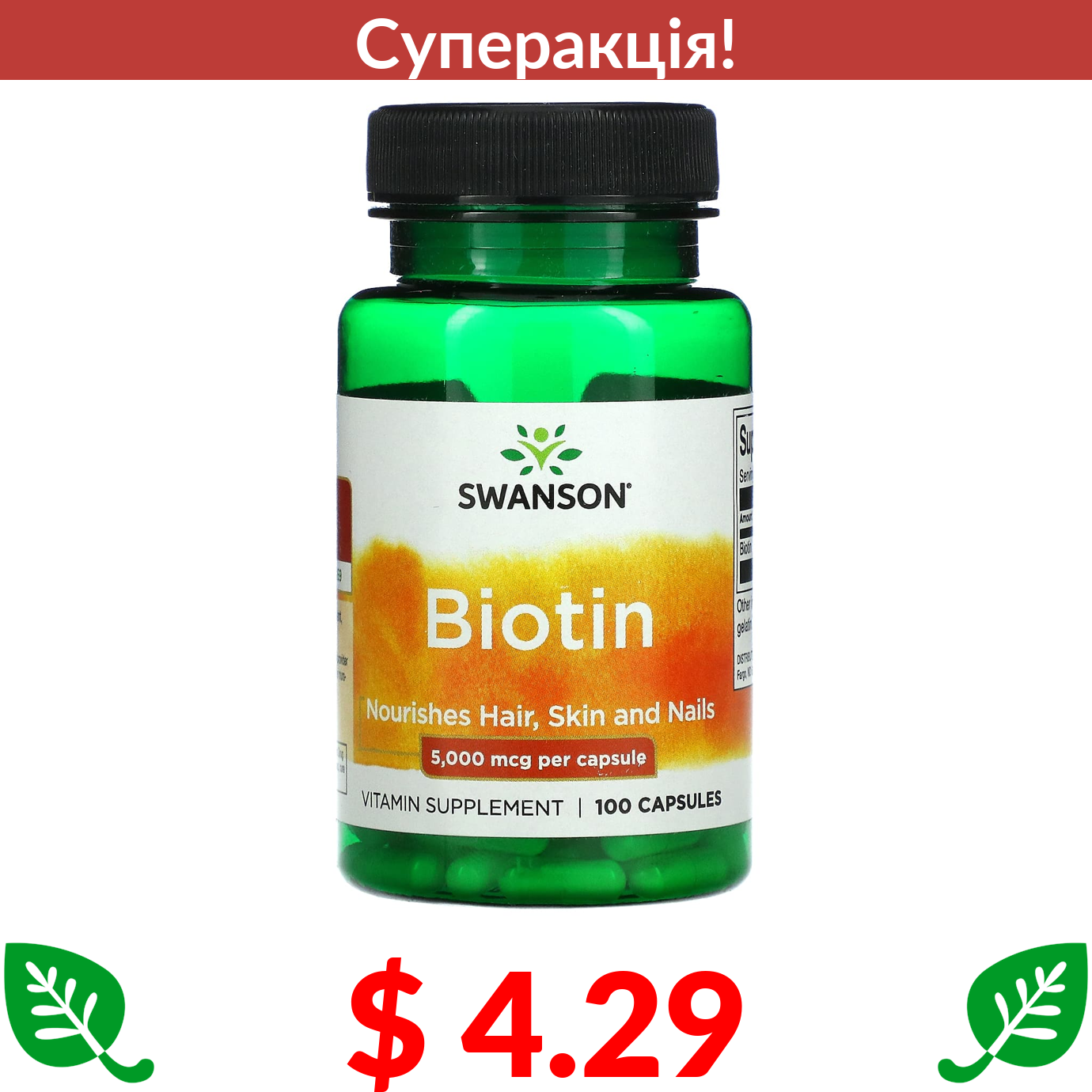 $ 4.29 Swanson, Біотин, 5000 мкг, 100 капсул
