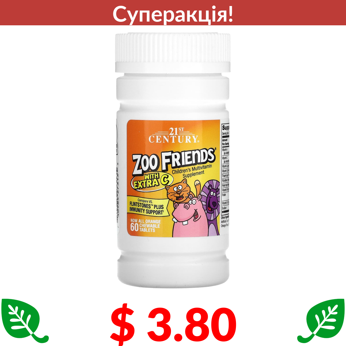 $ 3.80 21st Century, Zoo Friends з додаванням вітаміну C, апельсин, 60 жувальних таблеток