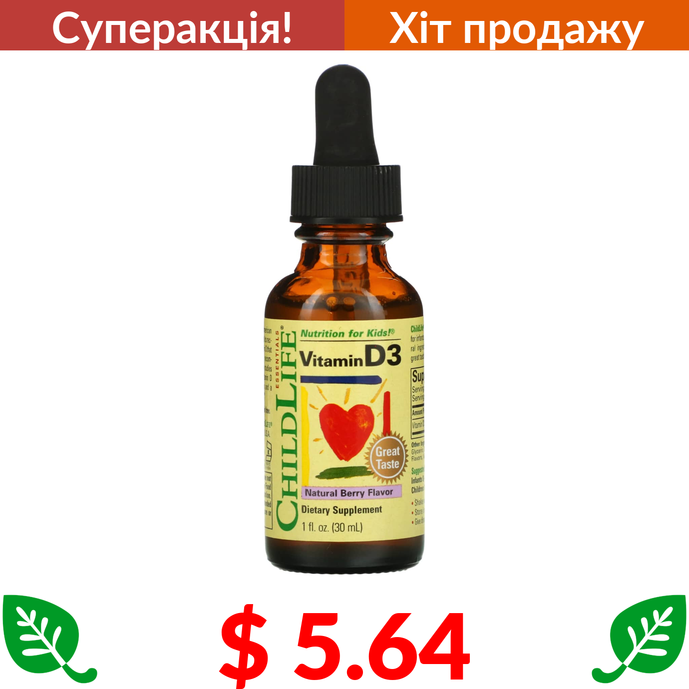 $ 5.64 ChildLife Essentials, вітамін D3, зі смаком натуральних ягід, 30 мл (1 рідк. унція)
