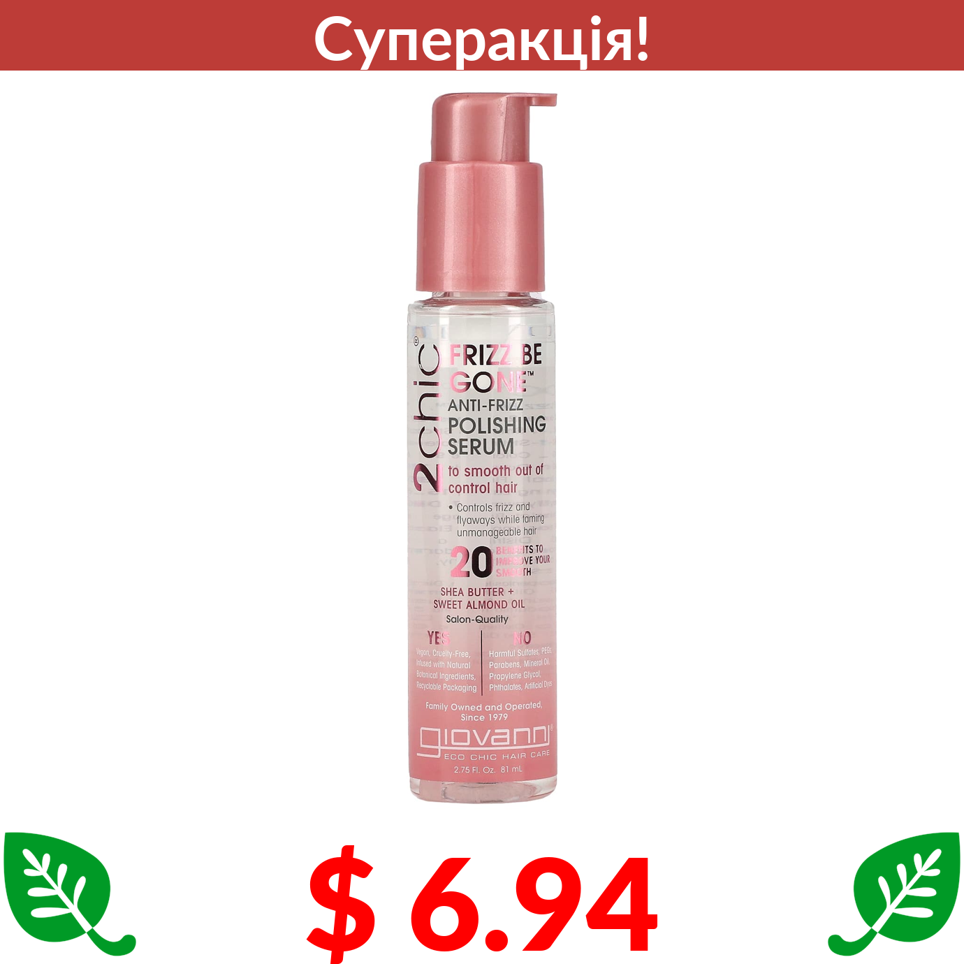 $ 6.94 Giovanni, 2chic, Frizz Be Gone, розгладжувальна сироватка проти пушіння, олія ши + олія солодкого мигдалю, 81 мл (2,75 рідк. унції)