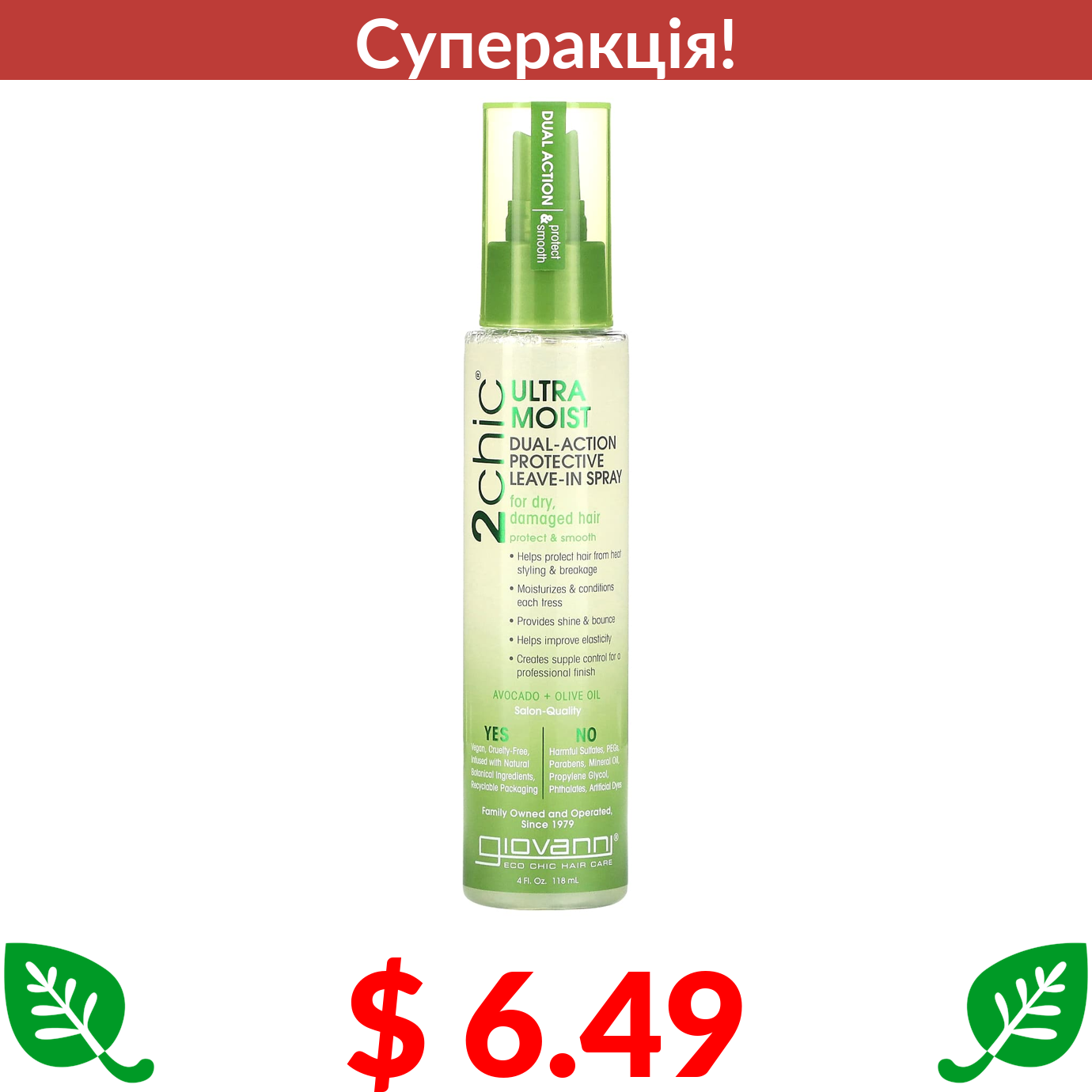 $ 6.49 Giovanni, 2chic, зволожувальний захисний спрей подвійної дії, не потрібно змивати, авокадо й оливкова олія, 118 мл (4 рідк. унції)