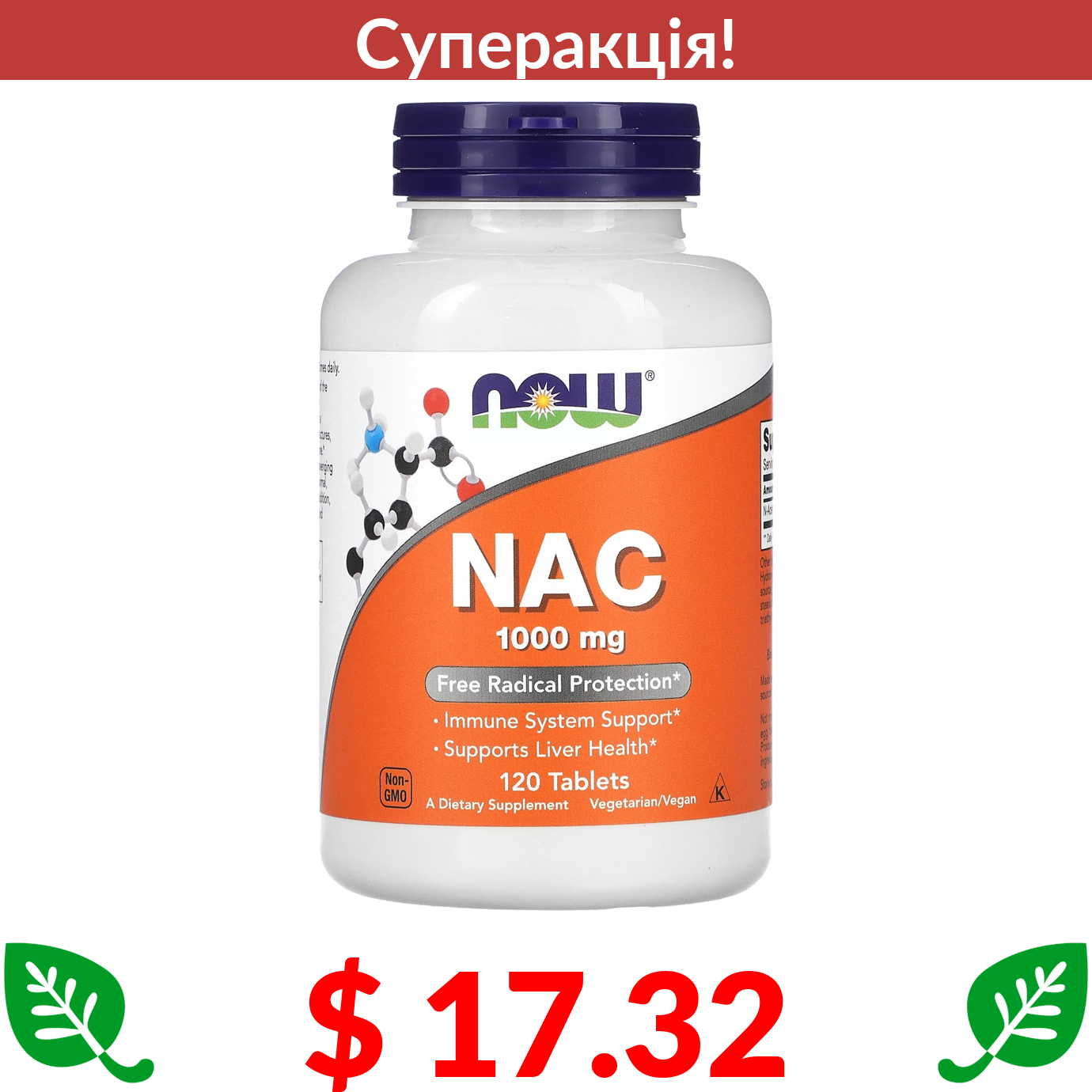 $ 17.32 Now Foods, N-ацетилцистеїн (NAC), 1000 мг, 120 таблеток