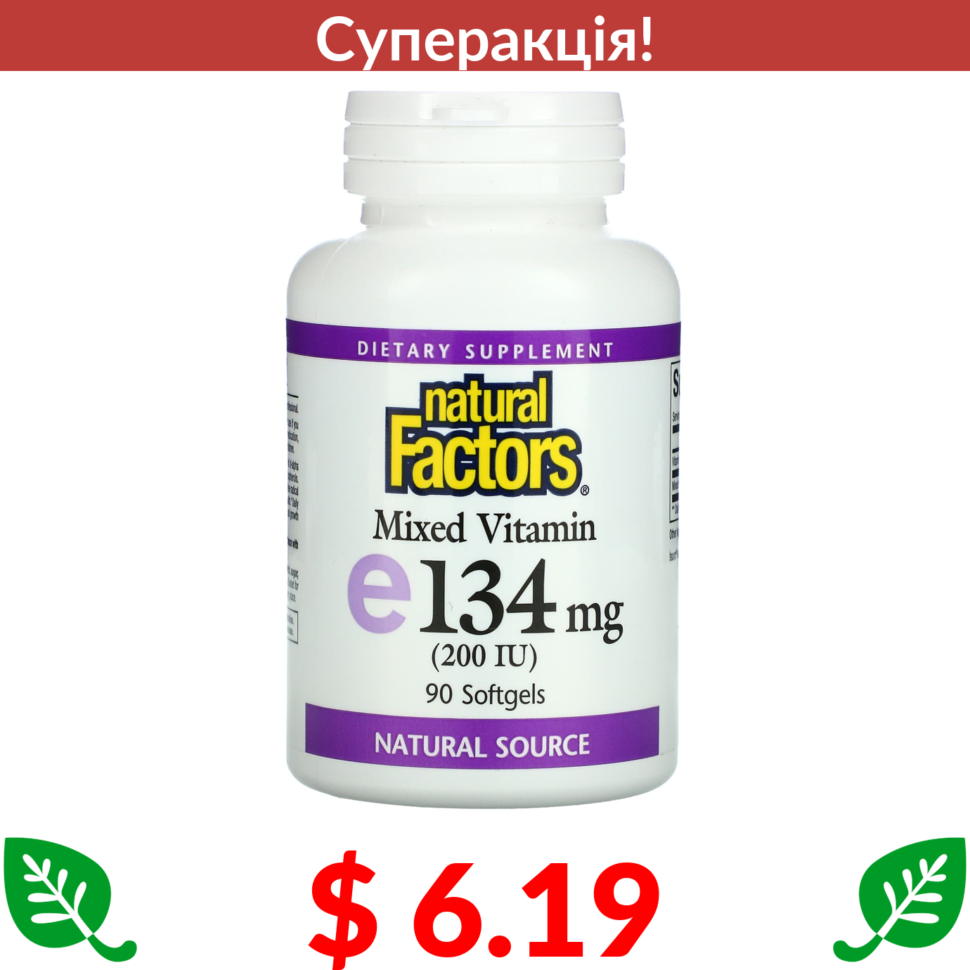 $ 6.19 Natural Factors, змішаний вітамін E, 200 МО, 90 капсул