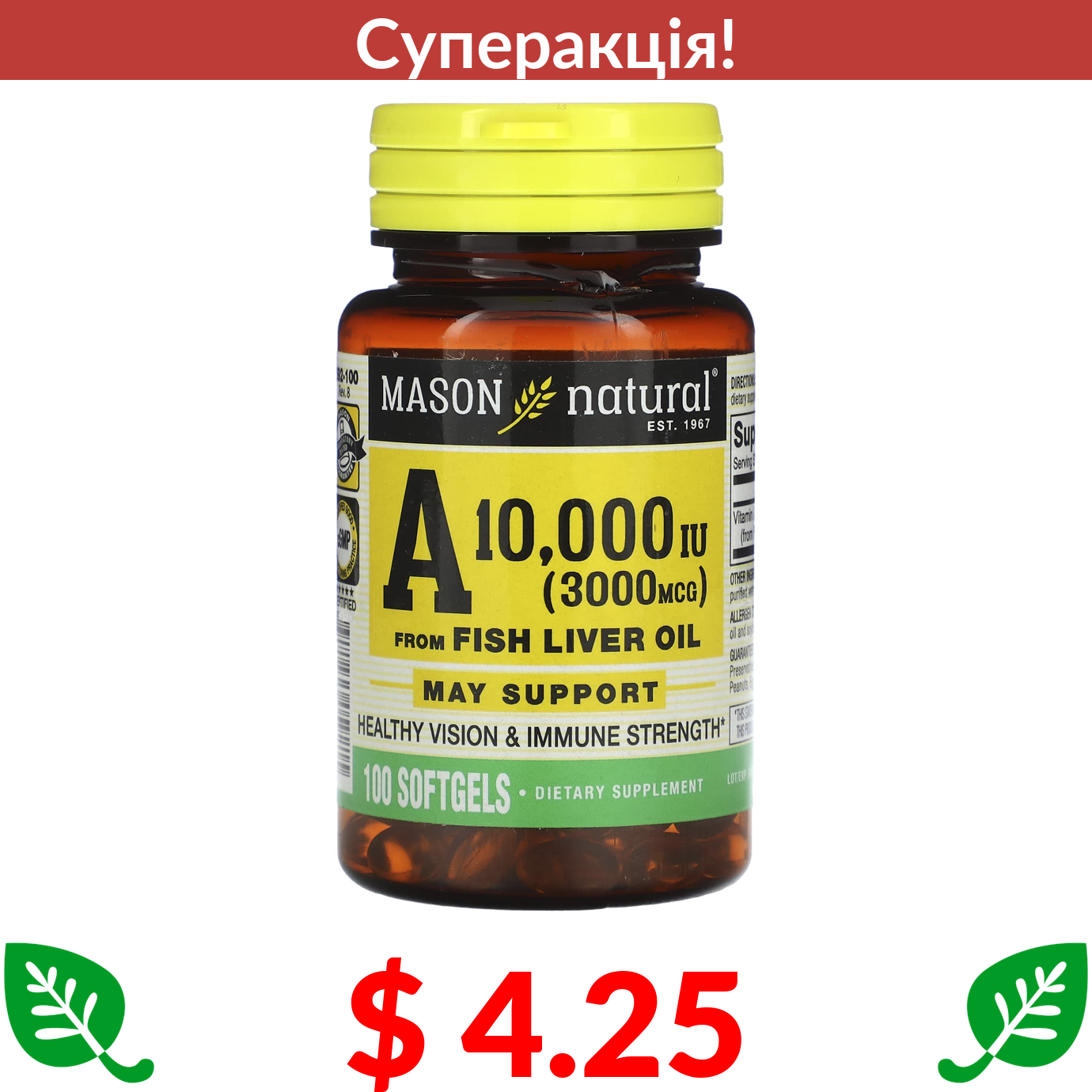 $ 4.25 Mason Natural, вітамін A з жиру печінки риби, 3000 мкг (10 000 МО), 100 капсул