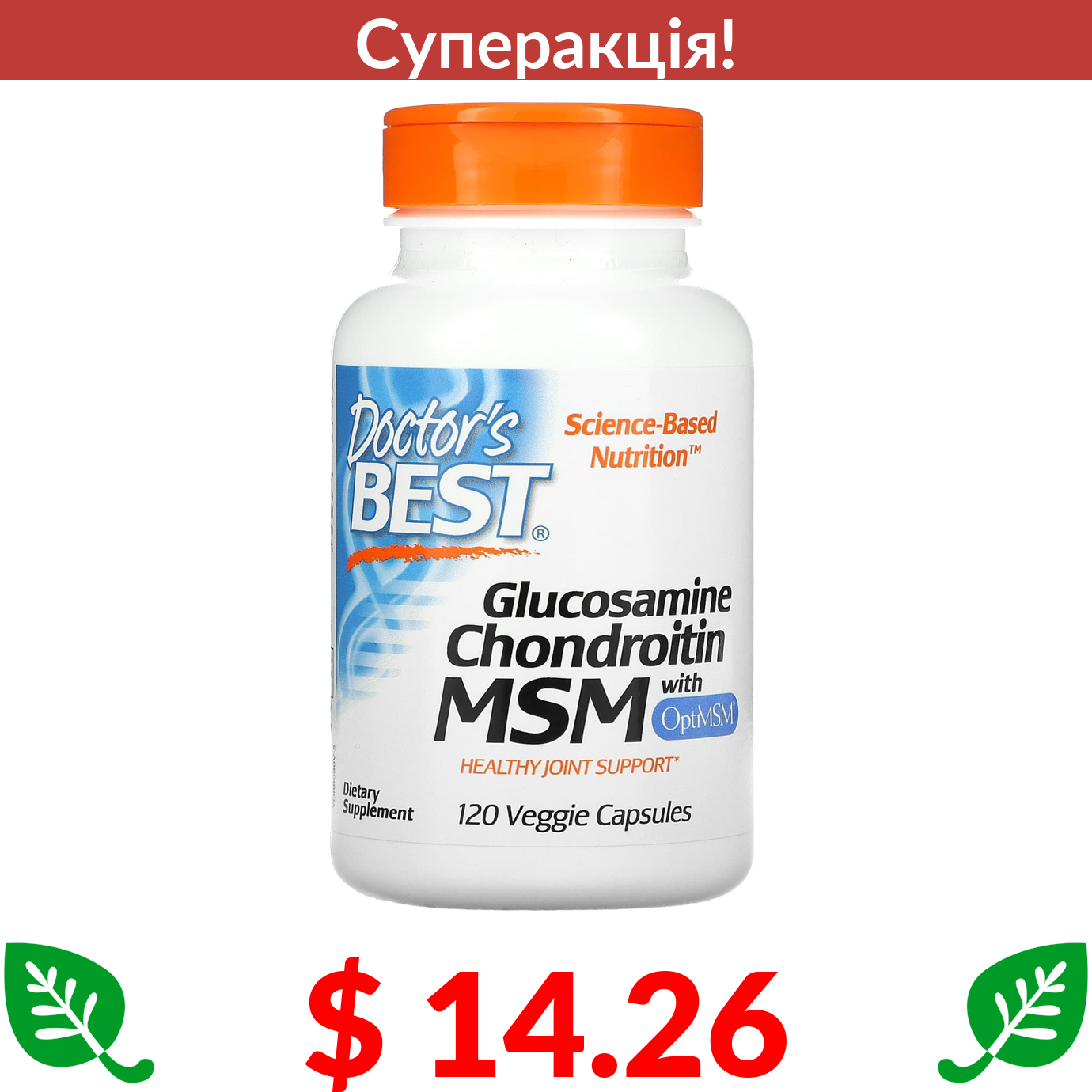 $ 14.26 Doctor's Best, глюкозамін, хондроїтин та МСМ з OptiMSM, 120 рослинних капсул