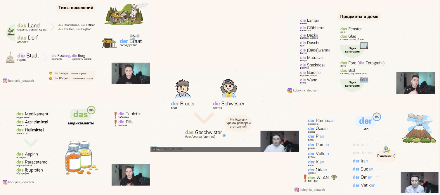 На курсе мы пройдем около 1400 существительных и разберем их артикли. Все они будут сгруппированы по лексическим темам.