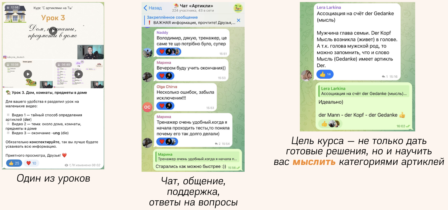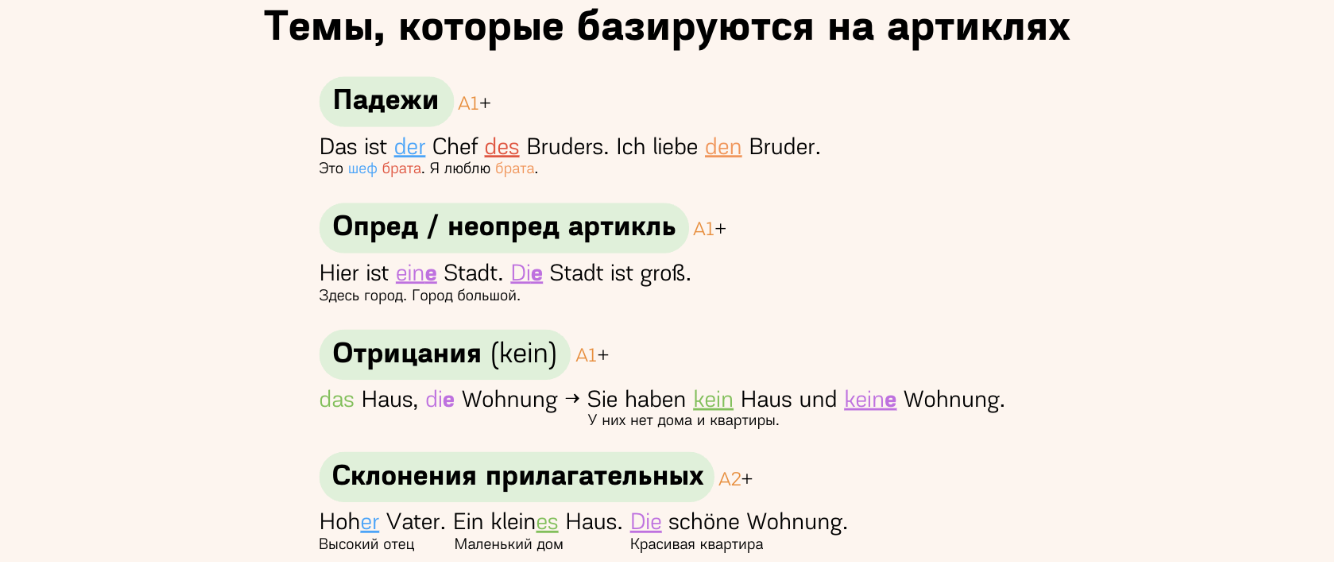 Курс посвящен пониманию самих артиклей у существительных, почему именно такой род, откуда он берется и тд.