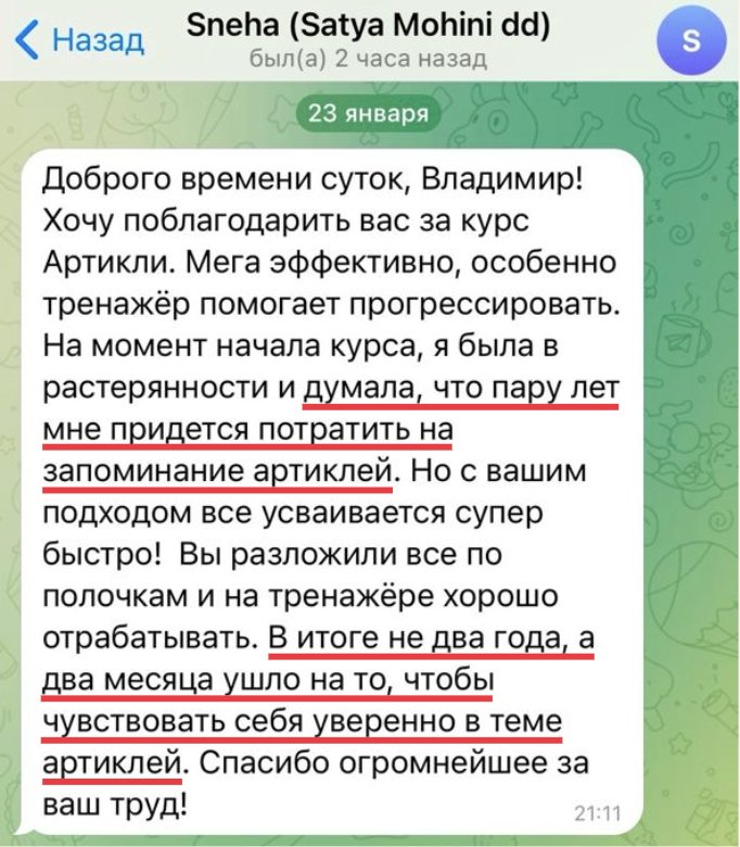 Доступ к тренажеру 1 год с момента покупки. В среднем ученики за 1-2 месяца проходят всю программу артиклей (зависит от темпа учебы), оставшееся время — практика и отработка в тренажере.