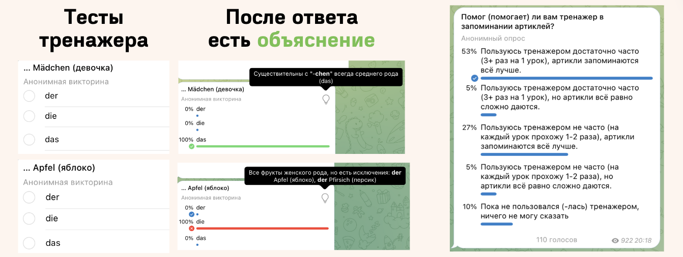 На курсе я провел честный опрос. 80% учеников отметили, что с тренажером артикли запоминаются лучше.