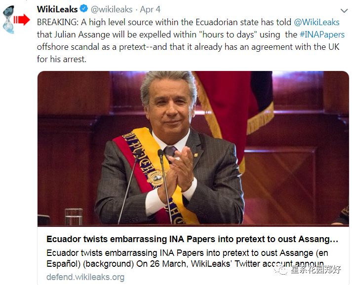 诚如厄瓜多尔前总统科雷亚吐槽的那样:“史上最无耻的叛徒,现总统莫雷诺用阿桑奇的命,换了42亿美元…”现在英国政府正准备把阿桑奇引渡给“有死刑的美国”。在感受到生命威胁后,新世纪的佐罗,阿桑奇扔出了一枚核弹: