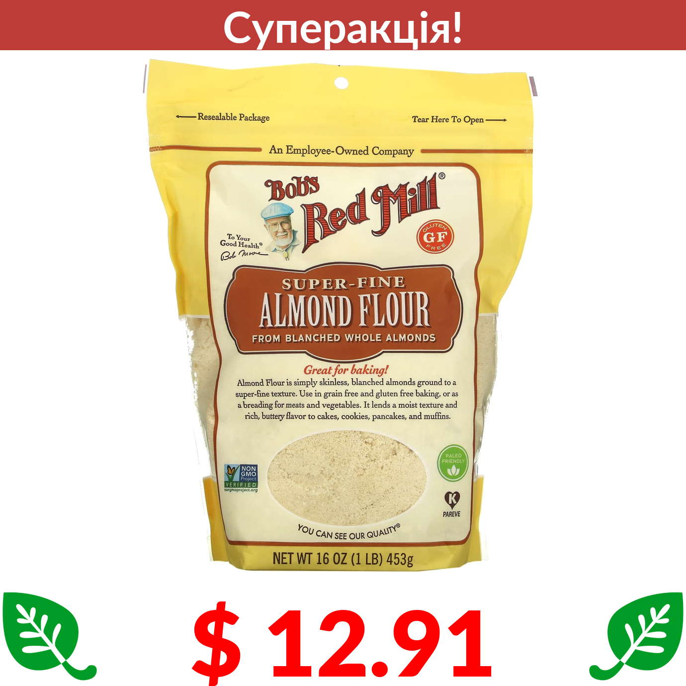 $ 12.91 Bob's Red Mill, мигдальне борошно дуже тонкого помелу, 453 г (16 унцій)