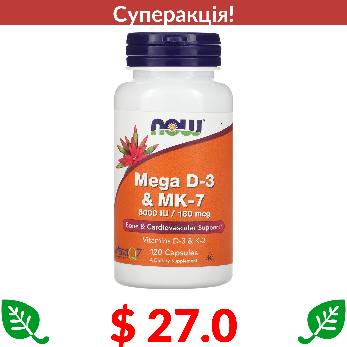 $ 27.0 Now Foods, Mega D-3 і MK-7, 120 капсул