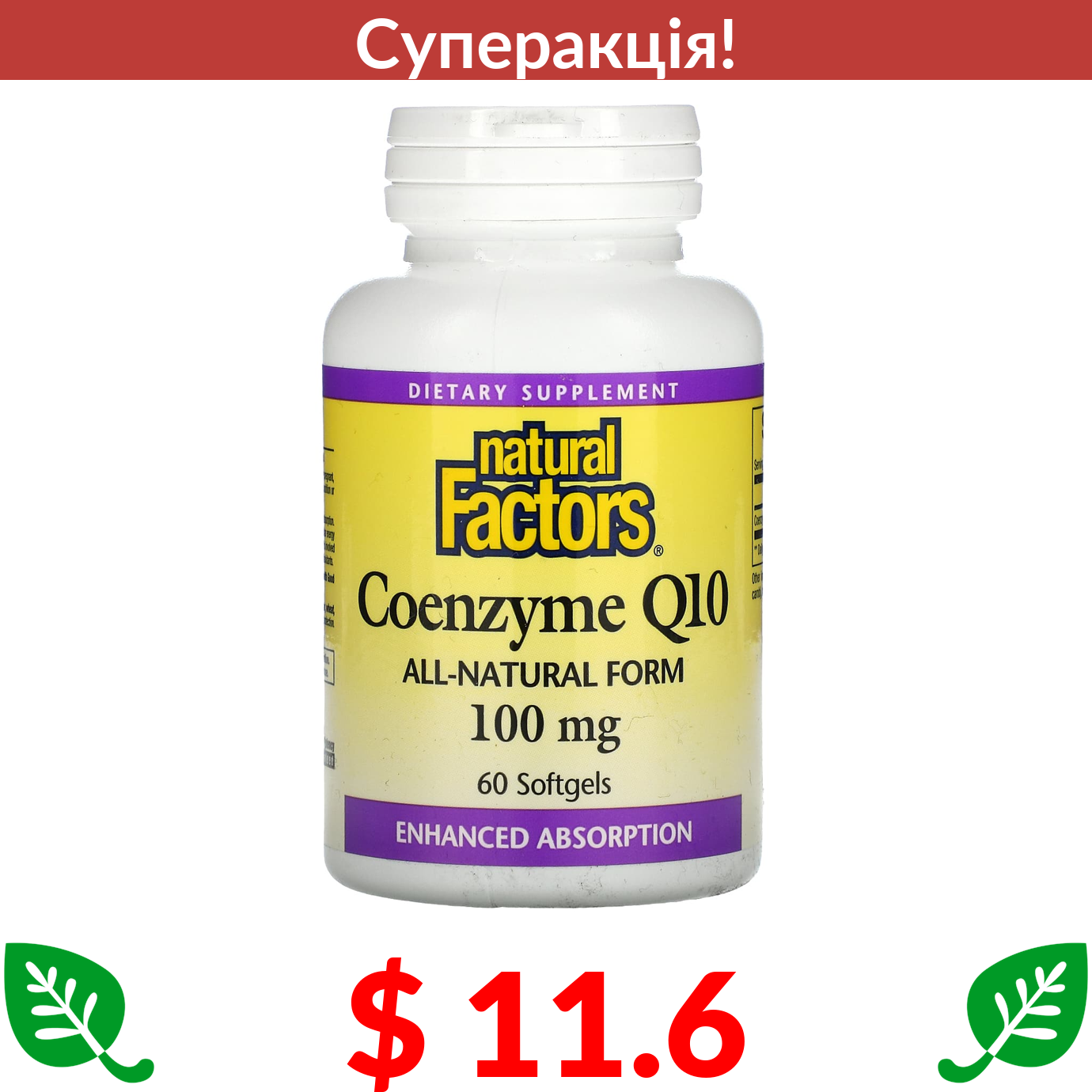$ 11.6 Natural Factors, коензим Q10, 100 мг, 60 капсул