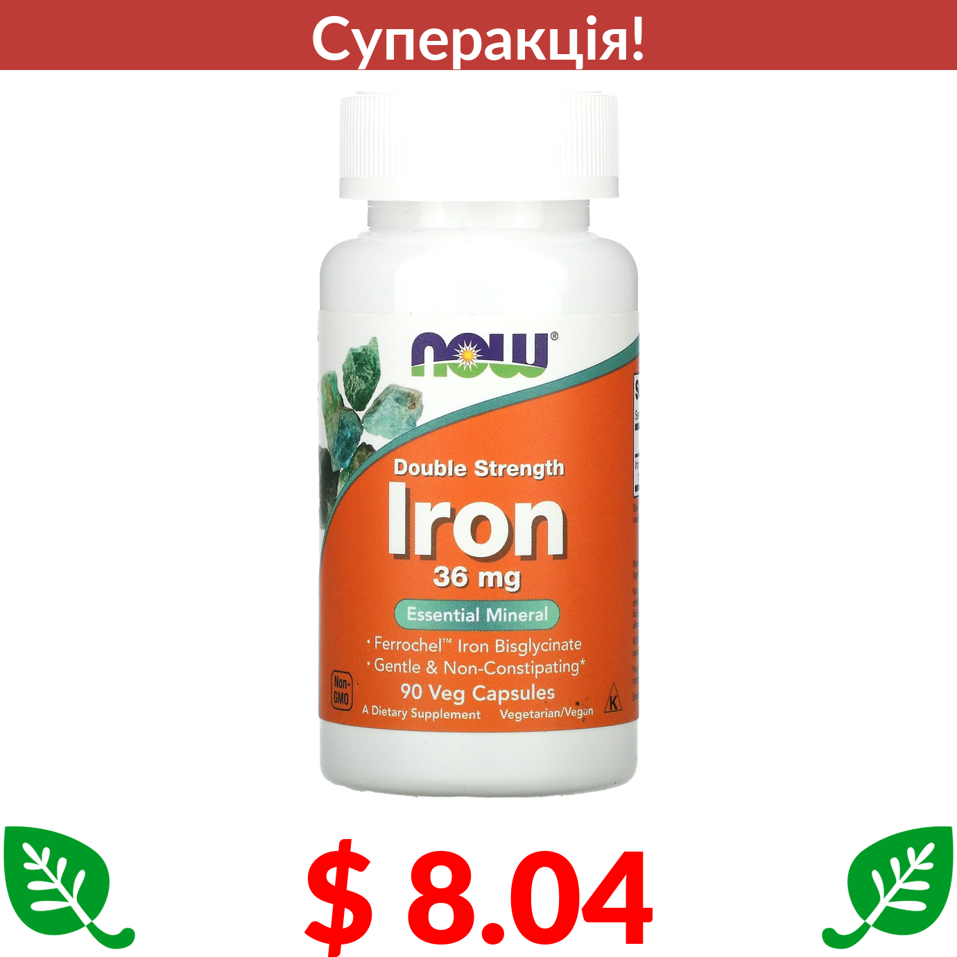 $ 8.04 Now Foods, залізо подвійної концентрації, 36 мг, 90 вегетаріанських капсул