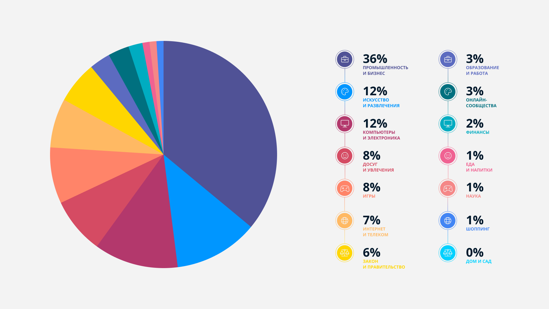 На следующей позиции можно объединить сферы «Интернет и телеком», а также «Закон и правительство». В первую входят интернет-провайдеры и их сервисы, в том числе телефония. Ко второй сфере относятся государственные структуры: правительственные СМИ, информационные ресурсы, финансовые организации, а также всё, что напрямую или косвенно связано с правительством.