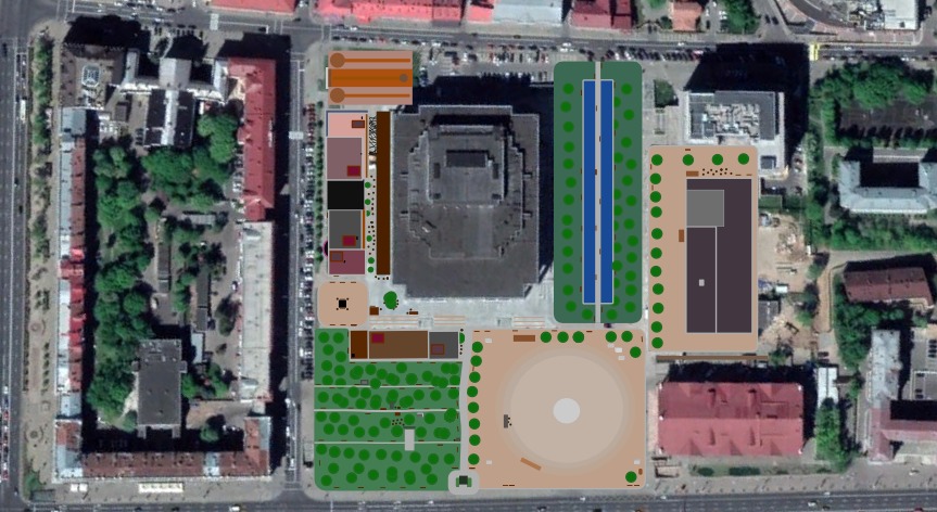 прастора перад палацам дзеліцца ў раёне нулявога кіламетру на дзве часткі, якія паступова пераходзяць адна ў адну. частка на захадзе - прыклад азелянёнай плошчы, частка на ўсходзе адаптавана для сацыяльных і гарадскіх актыўнасцяў. абедве часткі маюць месцы для сядзення, месцы прыцягнення пешаходаў і разнастайныя малыя цікавосткі. арт-аб'екты замест вострава камсамольцаў таксама можна звазіць сюды, адкуль ужо размяркоўваць па горадзе.