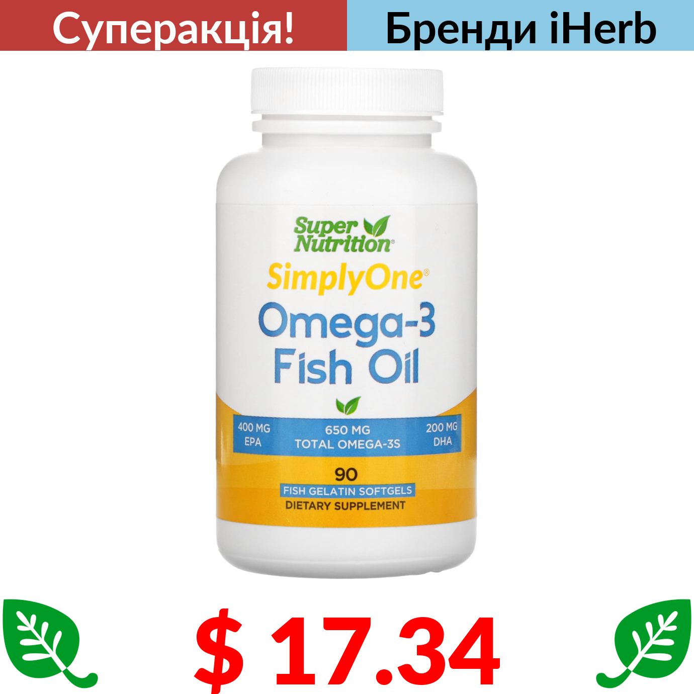 $ 17.34 Super Nutrition, риб’ячий жир з омега-3, 1000 мг, 90 капсул з риб’ячого жиру