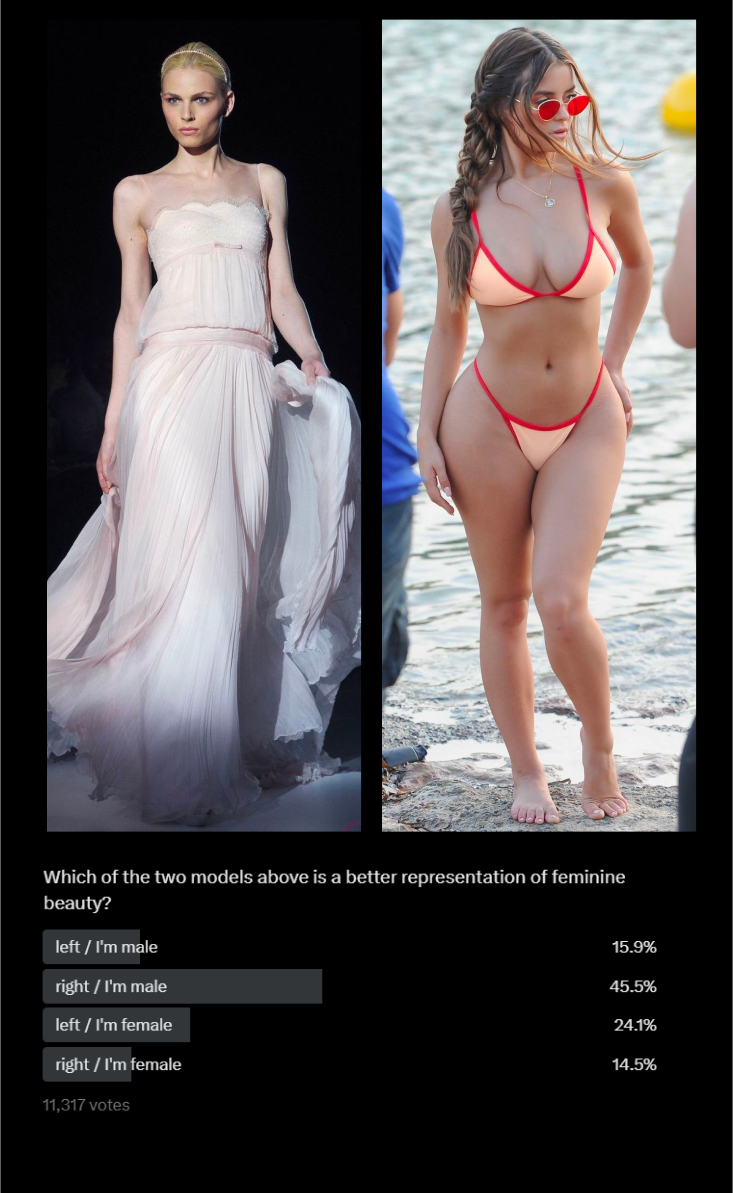 Их буквально приучили верить, что у мужчин получается быть более красивыми женщинами, чем у самих женщин. И более того, они осуждают тех мужчин, кто предпочитает женскую модель справа, как «женоненавистников» лол. Тут уж не знаешь, смеяться или плакать.