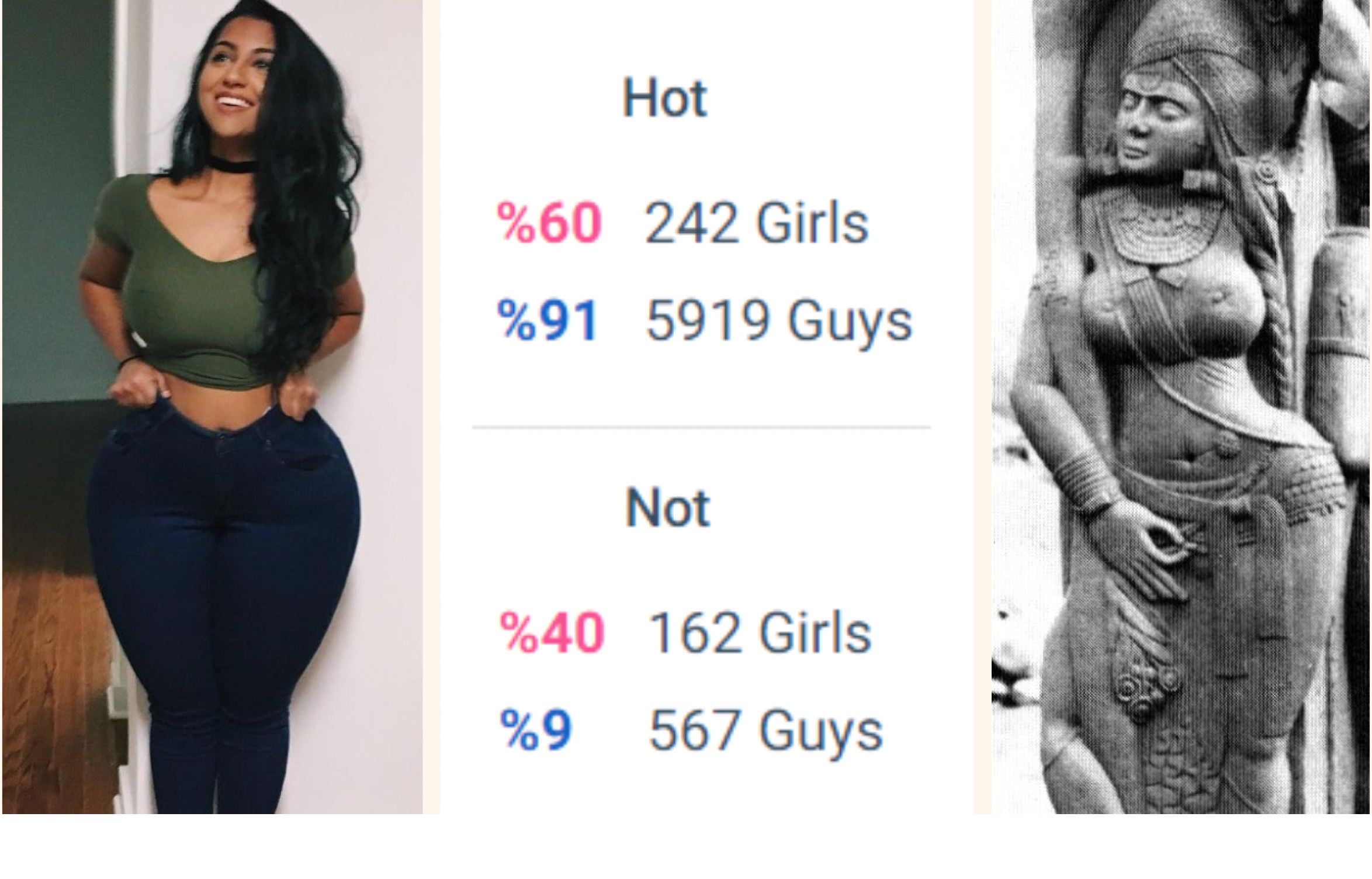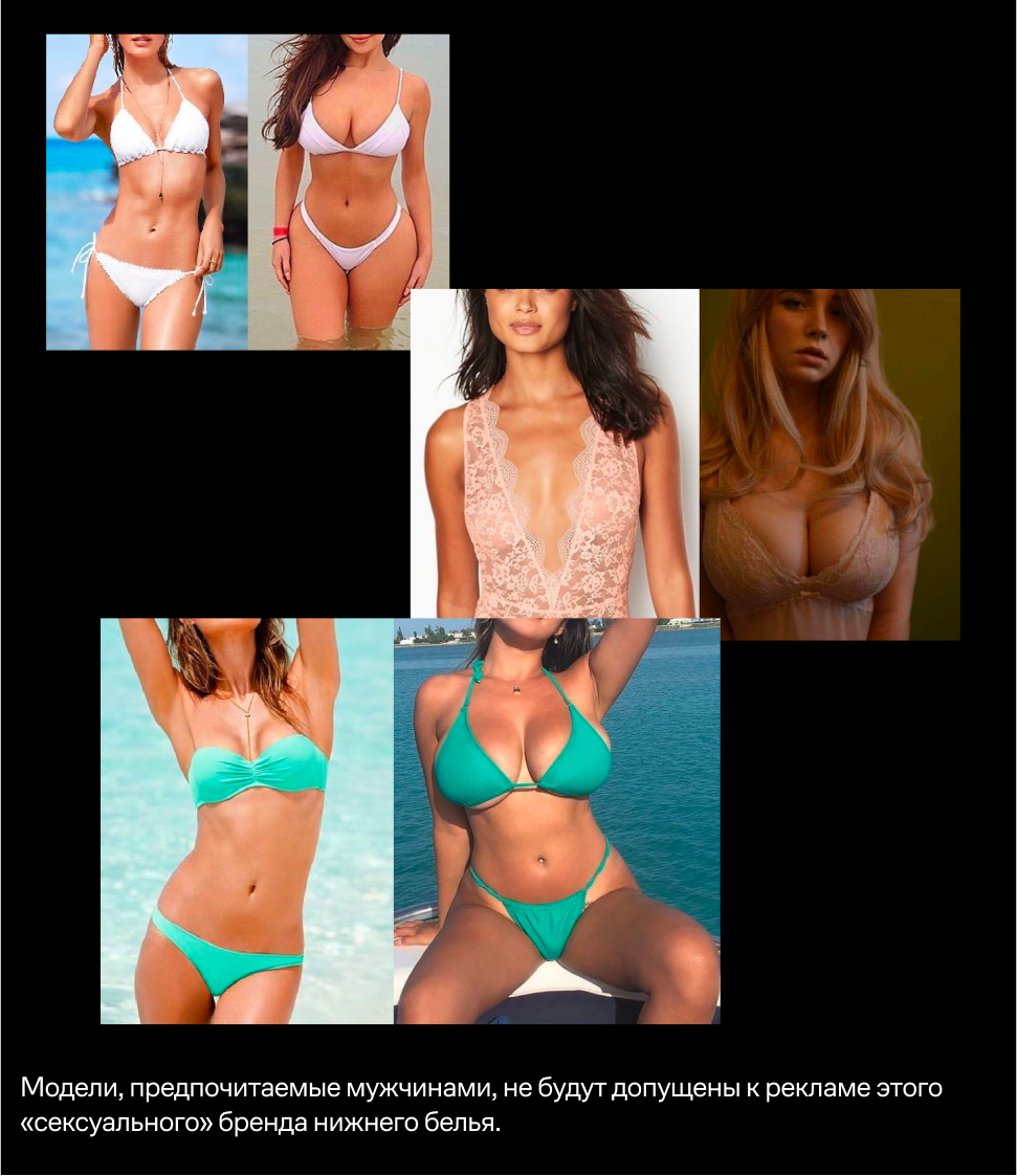 Обратите внимание, что на рисунках на картинке выше не просто грудь больше, чем у моделей и актрис, но также более широкие бедра, более толстые ноги и более высокий процент жира. Та же закономерность прослеживается на изображениях ниже, на которых типичные модели известного «сексуального» бренда нижнего белья сравниваются с одинаково одетыми женщинами, которых большинство мужчин сочтут более привлекательными.