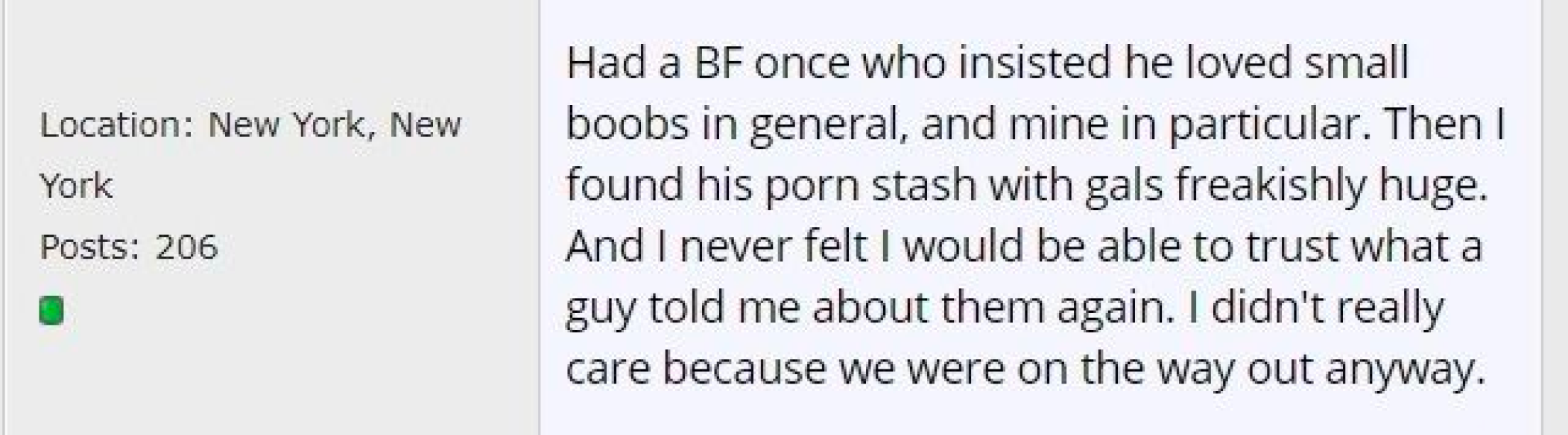 Таким образом, скептики сталкиваются с невозможным вопросом: если парням не нравится большая грудь, почему они продолжают ее искать, когда девушки не видят? Мужчины почти всегда занижают свои предпочтения по размеру груди, чтобы сделать среднестатистических девушек счастливыми.