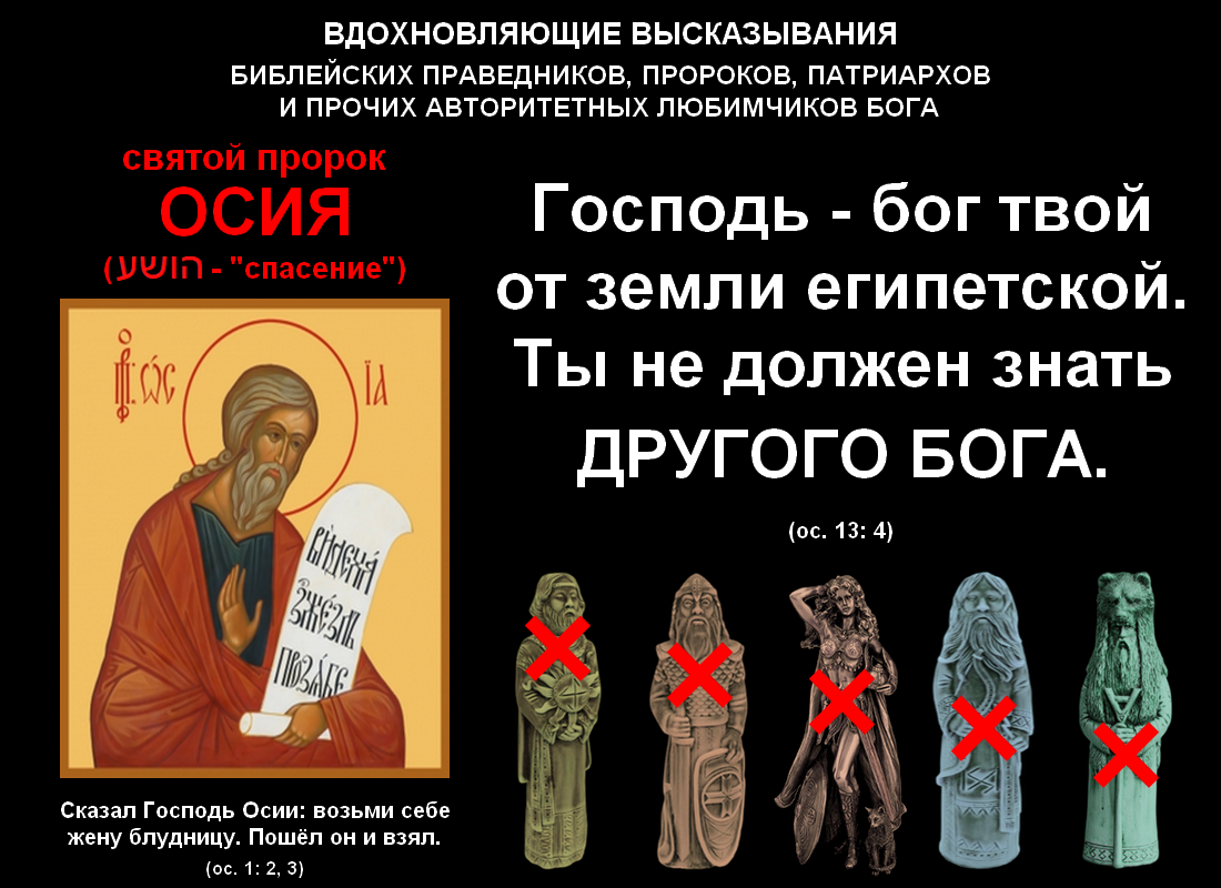 В "пророческом" разделе Библии свидетельств того, что её центральный персонаж является богом не единственным, тоже немало. Например, святой Осия, пишущий в тринадцатой главе книги, названной его именем, что "ты не должен знать другого бога", внезапностью своей мысли никого из читателей наверняка уже не удивляет. Аналогично ему и святой Софония, обещающий во второй главе своей книги, что "страшен будет Господь, ибо истребит всех богов Земли (כל אלהי הארץ)", вряд ли сообщает что-то неожиданное. Тем не менее оба они, подобно другим упомянутым выше авторитетным мужчинам, наличие в библейском мире огромного количества разных богов подтверждают несомненно.