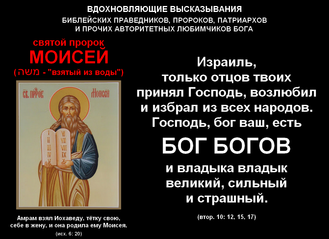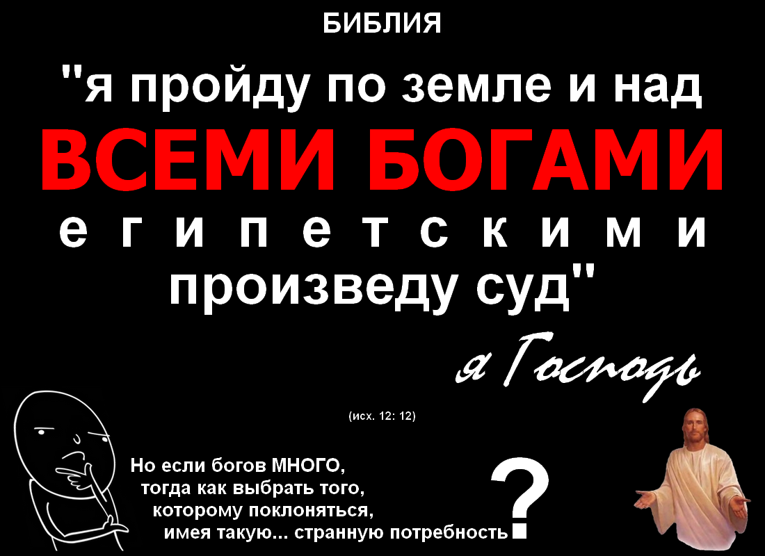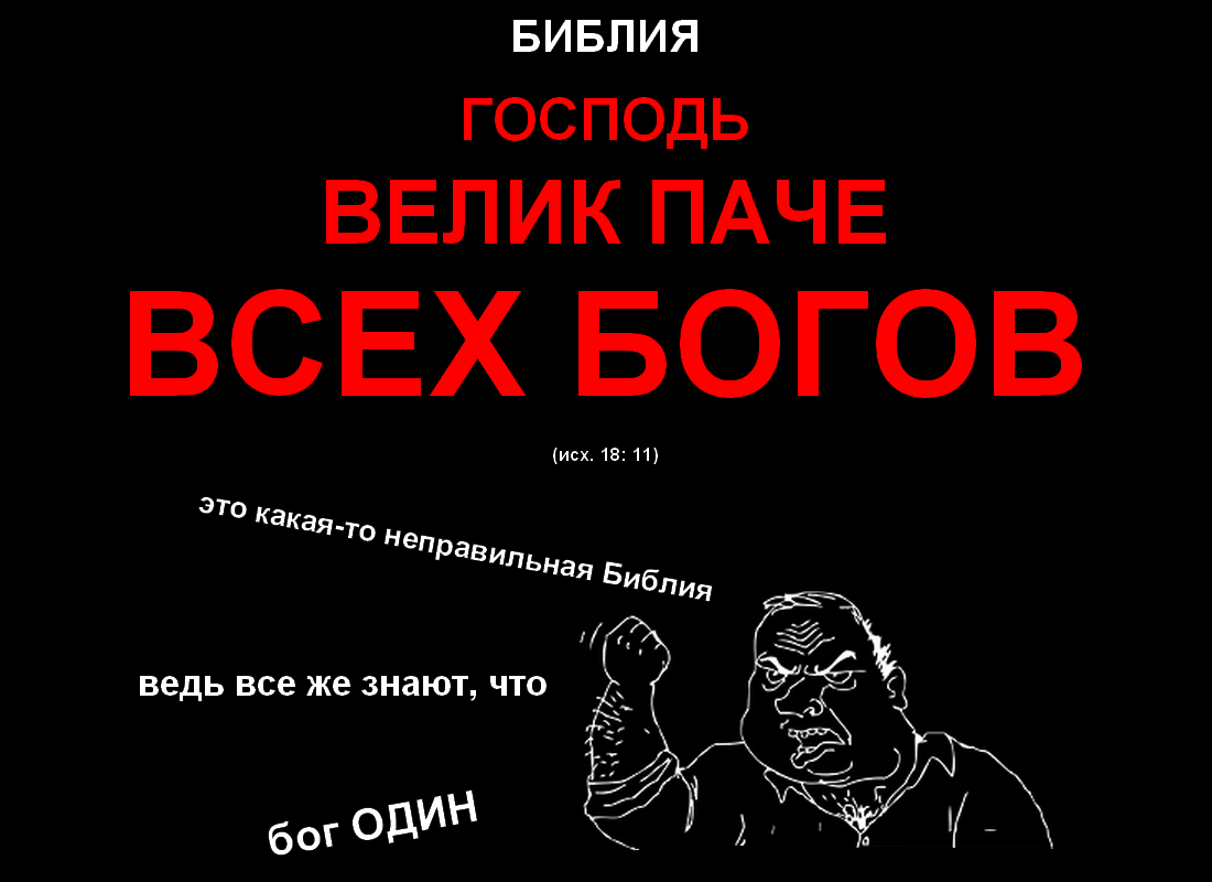 В Исходе свидетельств того, что помимо центрального персонажа Библии её сказочный мир населяют и другие боги, значительно больше, чем в Бытии, а самые убедительные содержатся в двенадцатой и восемнадцатой главах этой замечательной книги. В первой из них центральный персонаж признаёт свою заурядность лично, обещая "над всеми богами египетскими (כל אלהי מצרבים)" произвести суд. Во второй же тесть святого пророка Моисея Иофор, также ещё являющийся и мадианитяским жрецом, а потому в данной теме несомненно очень компетентным, категорично утверждает, что "Господь велик паче всех богов (גדול יהוה מכל האלהים)".