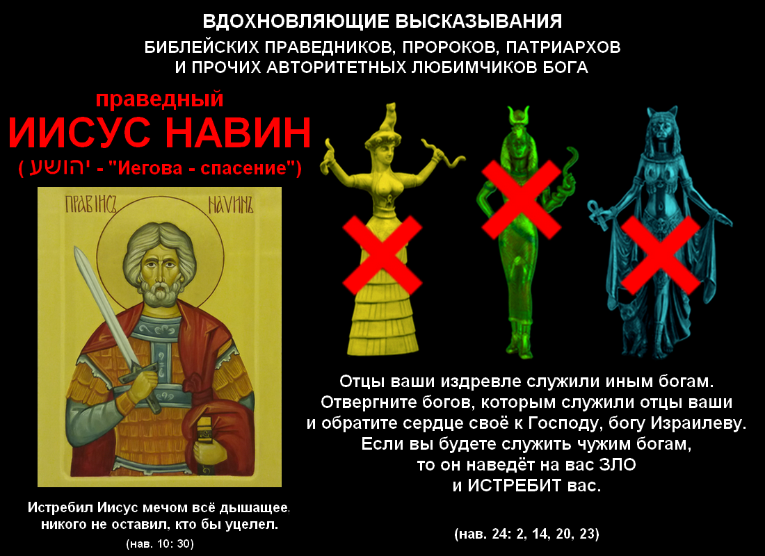 Далее, праведный Иисус Навин незадолго до своей смерти, а именно в двадцать четвёртой главе книги, названной его именем, выступая перед соплеменниками, напоминает им, что их "отцы издревле служили иным богам (אלהים אחרים)". Затем, полагая, что соблюдение этой традиции категорически недопустимо, он приказом "отвергните богов, которым служили отцы ваши" требует от неё бескомпромиссно отказаться.