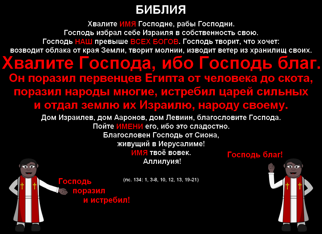е) сто тридцать пятой невероятная мощь "бога богов" опять обосновывается тем, что он "творит чудеса", создал "светила великие и звёзды", а также "поразил Египет, убил царей, отдал землю их Израилю, ибо вовек милость его".