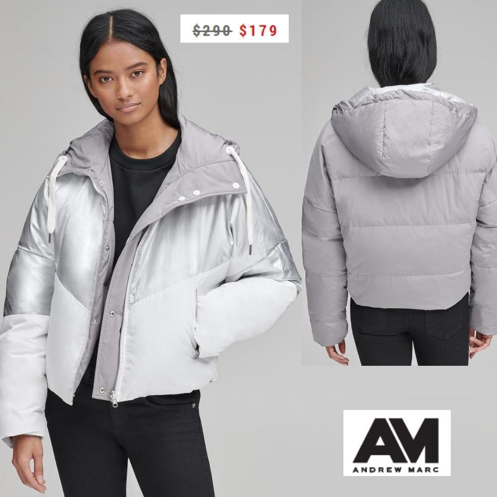 179,00 https://www.andrewmarc.com/product/luna+metallic+down+jacket.do