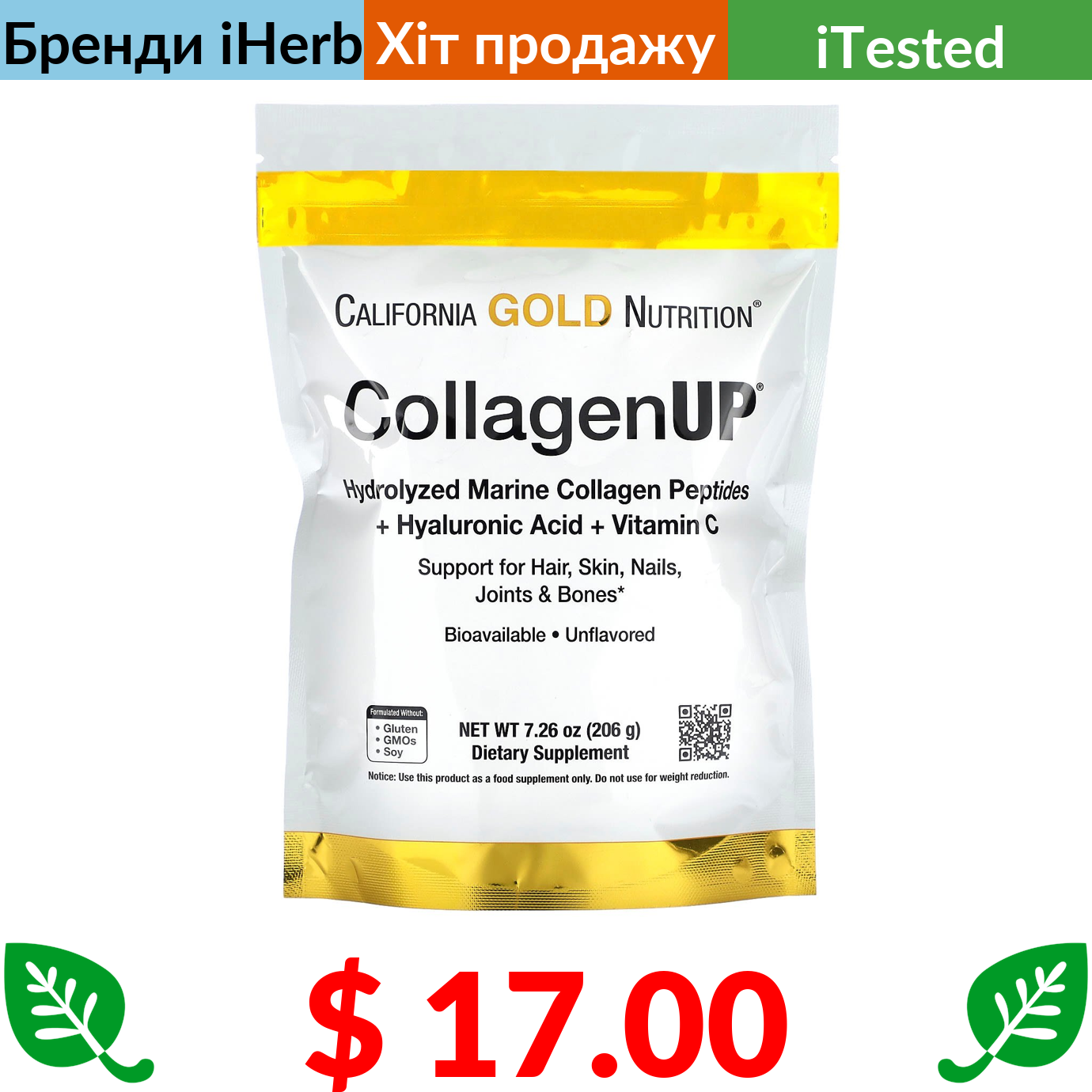 $ 17.00 California Gold Nutrition, CollagenUP, морський гідролізований колаген, гіалуронова кислота й вітамін С, без додатків, 206 г (7,26 унції)