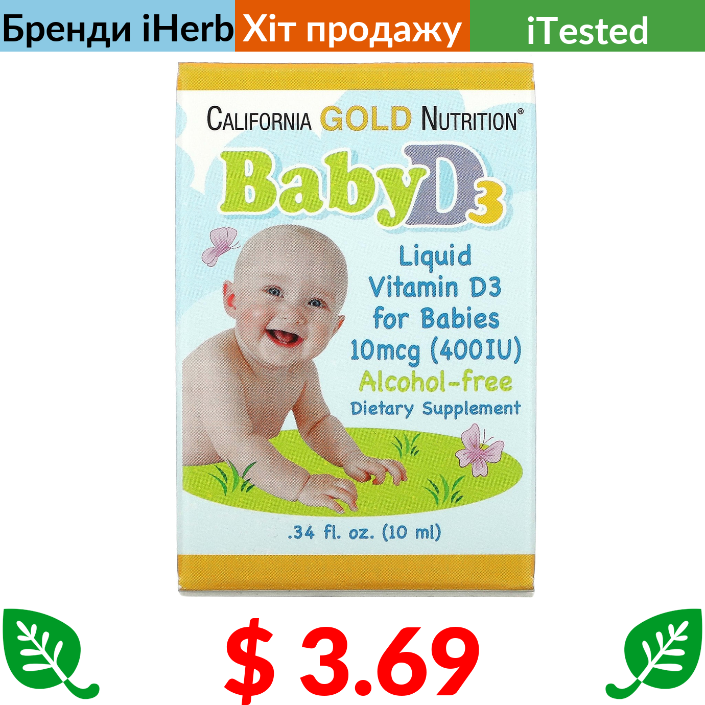 $ 3.69 California Gold Nutrition, вітамін D3 у рідкій формі для дітей, 10 мкг (400 МО), 10 мл (0,34 рідк. унції)