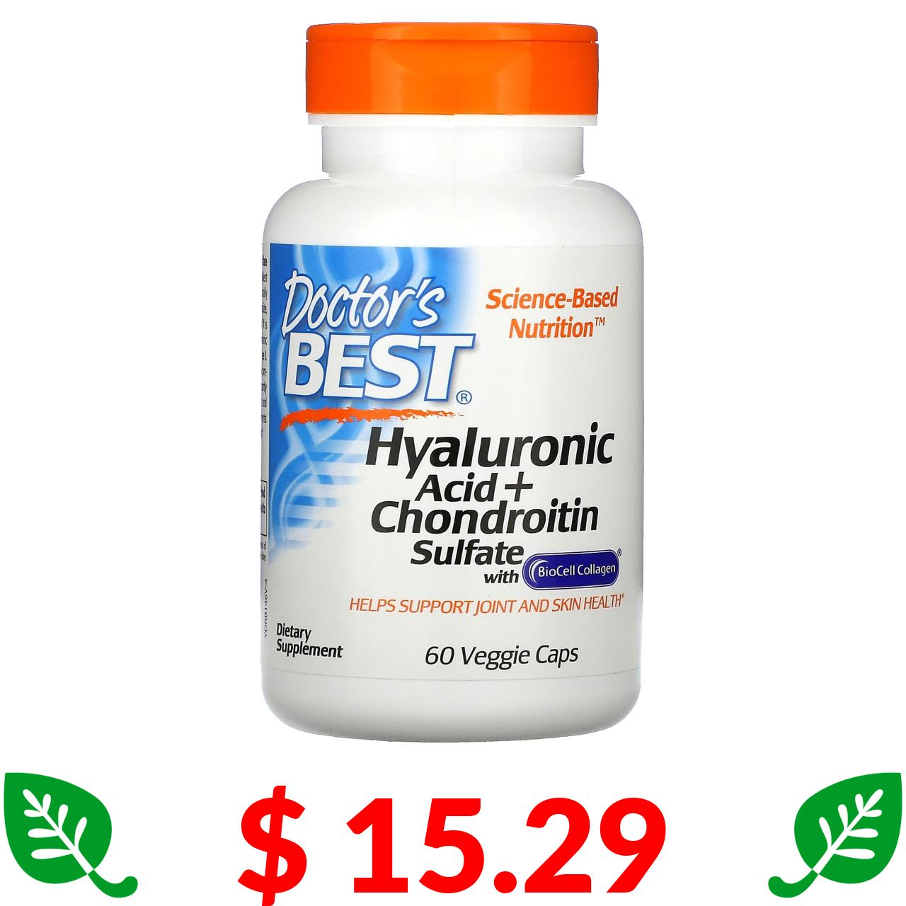 $ 15.29 Doctor's Best, Гіалуронова кислота і хондроїтинсульфат з колагеном BioCell Collagen, 60 рослинних капсул