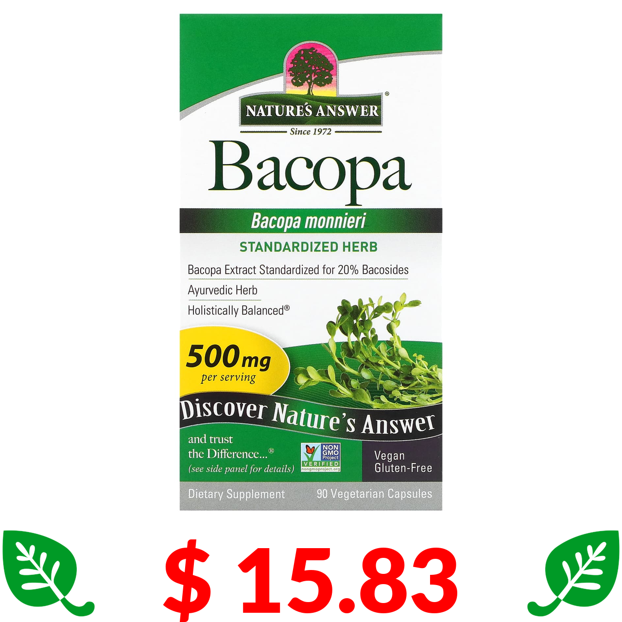 $ 15.83 Nature's Answer, бакопа, 500 мг, 90 вегетаріанських капсул