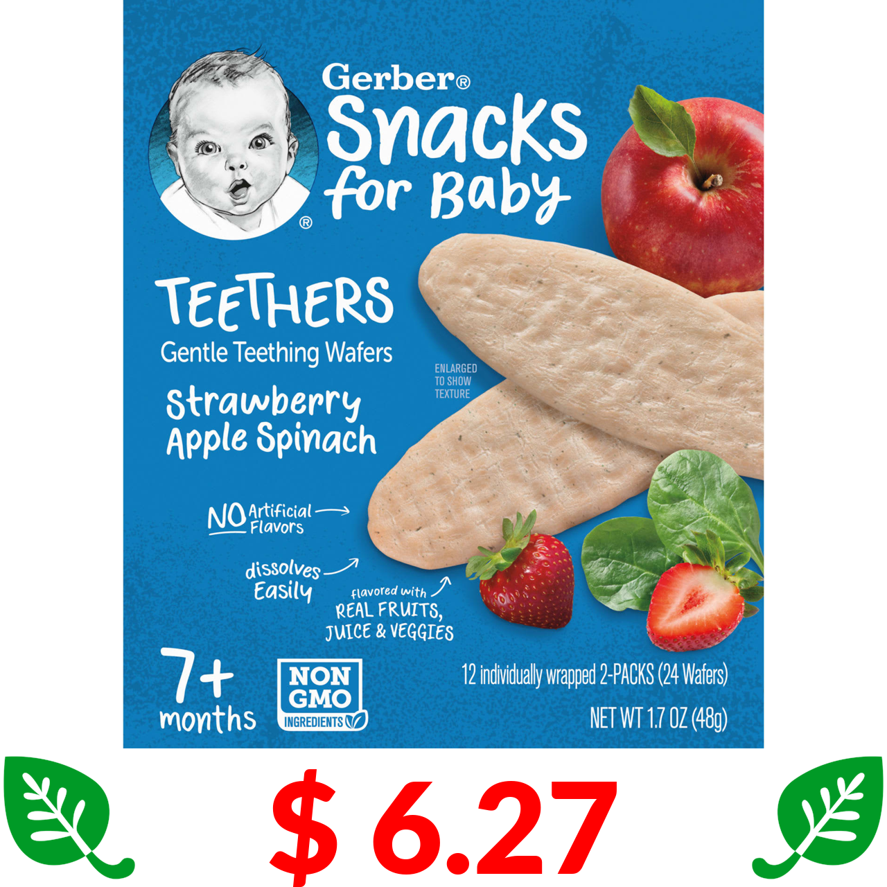 $ 6.27 Gerber, прорізувачі, вафлі для прорізування зубів, від 7 місяців, полуниця, яблуко, шпинат, 12 пакетиків, по 2 вафлі в кожному