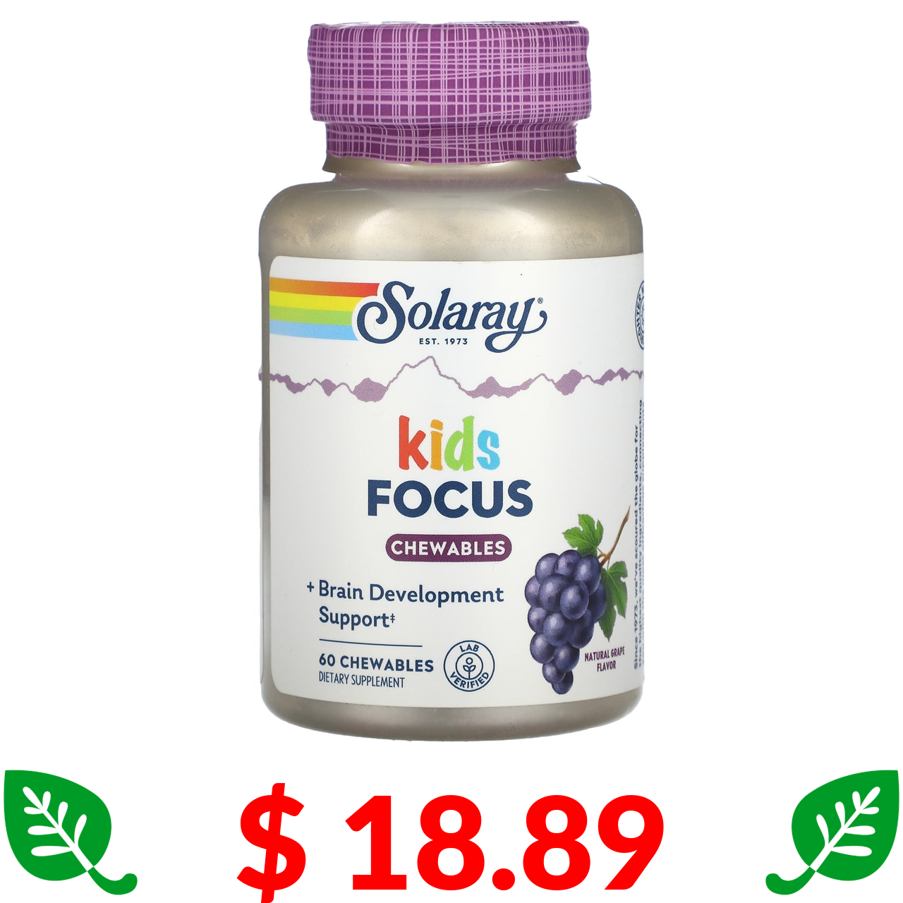 $ 18.89 Solaray, Focus For Children, жувальна добавка для дітей, натуральний виноград, 60 жувальних таблеток