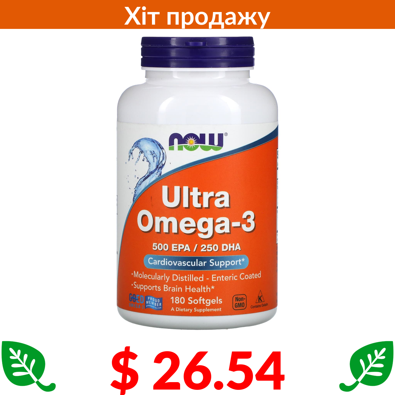 $ 26.54 Now Foods, Ultra Omega-3, 500 ЕПК / 250 ДГК, 180 капсул, вкритих кишковорозчинною оболонкою