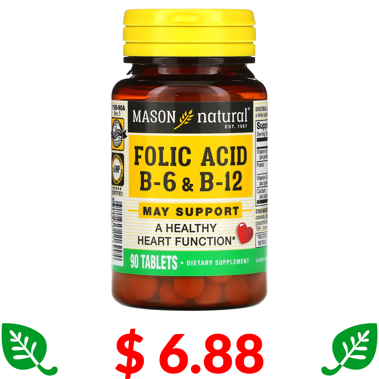 $ 6.88 Mason Natural, Фолієва кислота B6 і B12, 90 таблеток