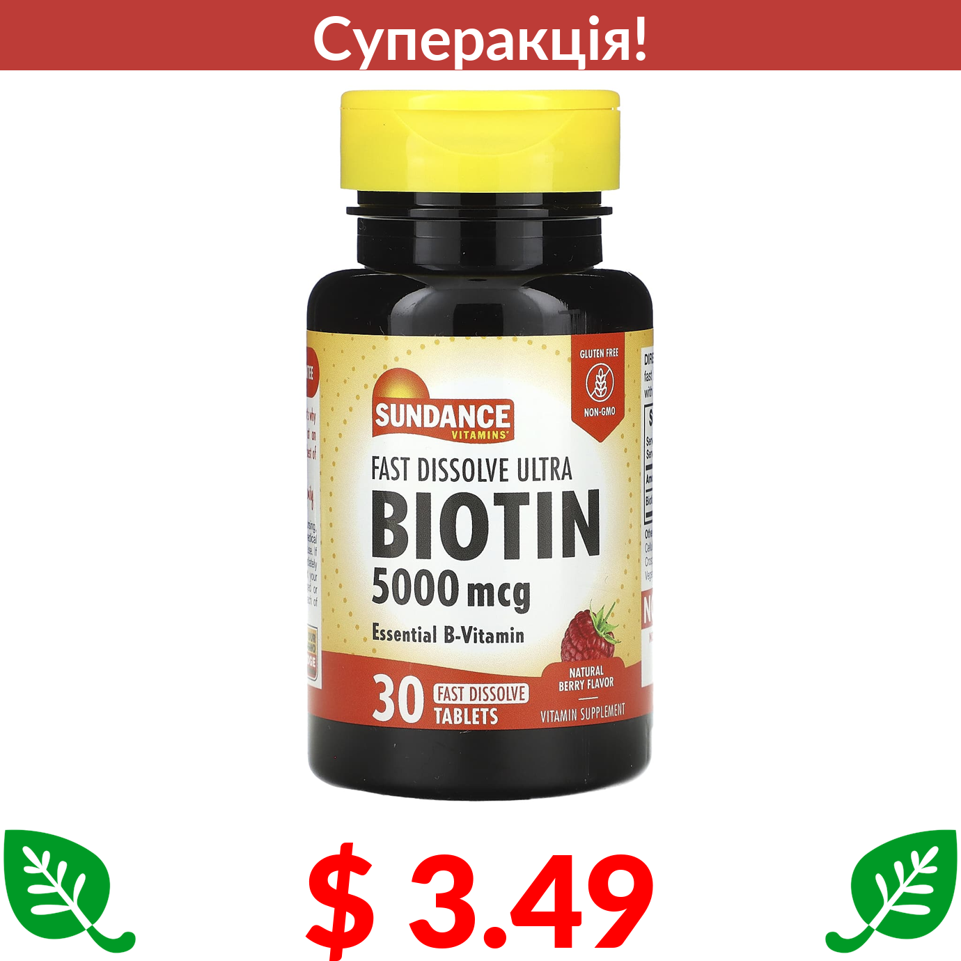 $ 3.49 Sundance, Fast Dissolve Ultra Biotin, натуральні ягоди, 5000 мкг, 30 швидкорозчинних таблеток